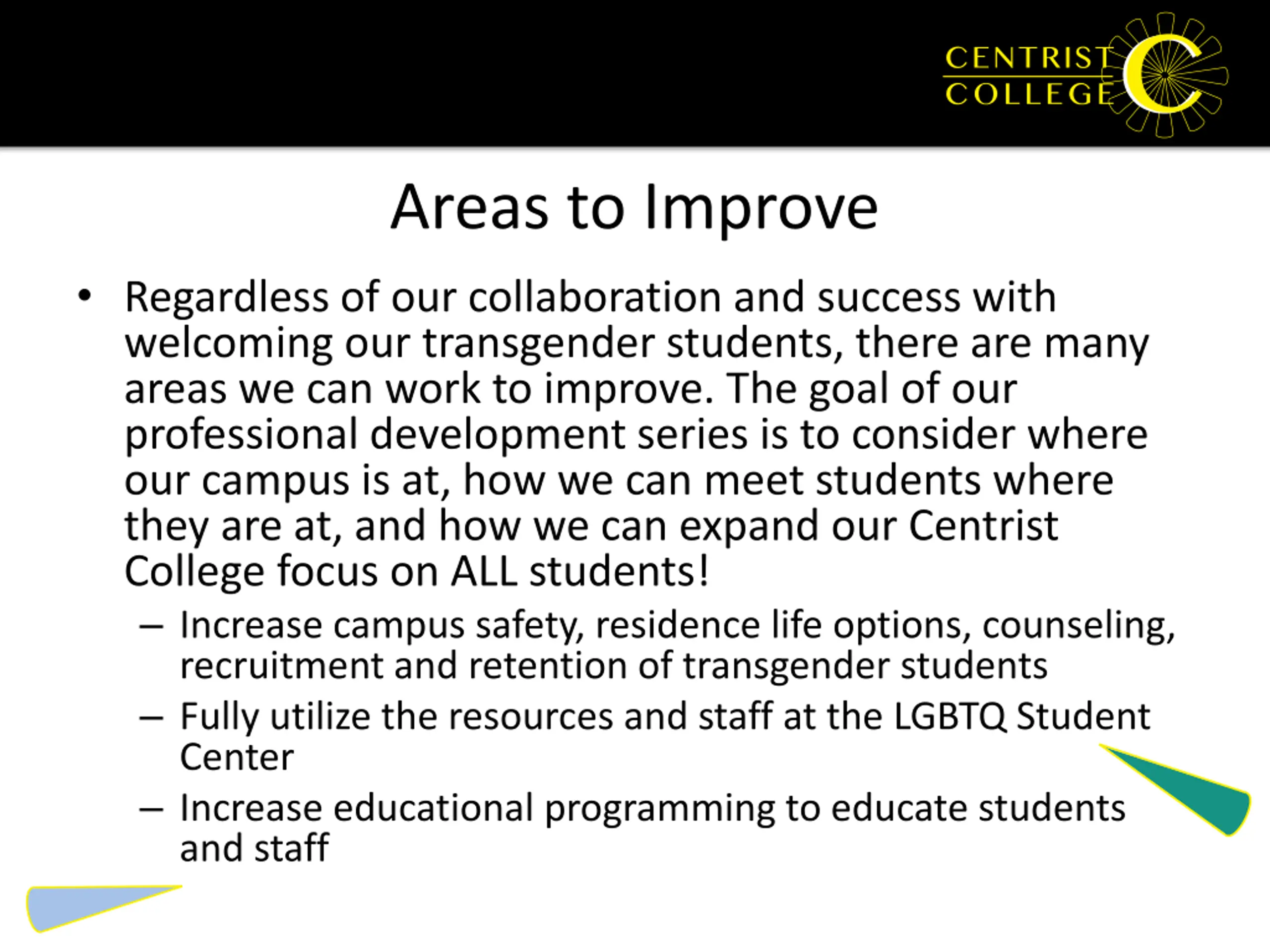 Areas to Improve Regardless of our collaboration and success with welcoming our transgender students, there are many areas we can work to improve. The goal of our professional development series is to consider where our campus is at, how we can meet students where they are at, and how we can expand our Centrist College focus on ALL students! Increase campus safety, residence life options, counseling, recruitment and retention of transgender students Fully utilize the resources and staff at the LGBTQ Student Center Increase educational programming to educate students and staff