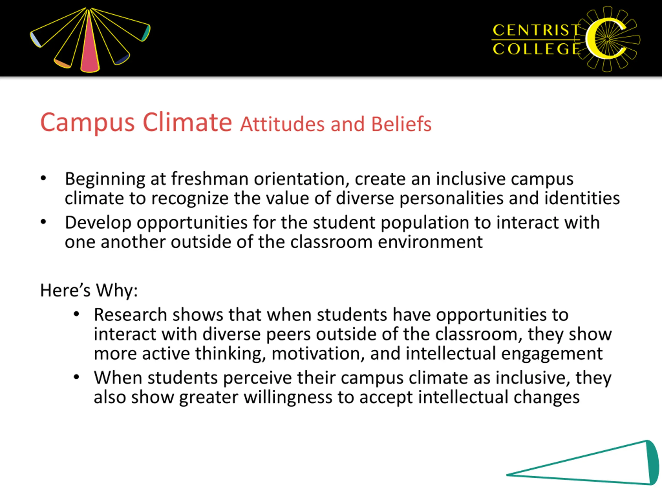 Campus Climate Attitudes and Beliefs Beginning at freshman orientation, create an inclusive campus climate to recognize the value of diverse personalities and identities Develop opportunities for the student population to interact with one another outside of the classroom environment Here s Why: Research shows that when students have opportunities to interact with diverse peers outside of the classroom, they show more active thinking, motivation, and intellectual engagement When students perceive their campus climate as inclusive, they also show greater willingness to accept intellectual changes