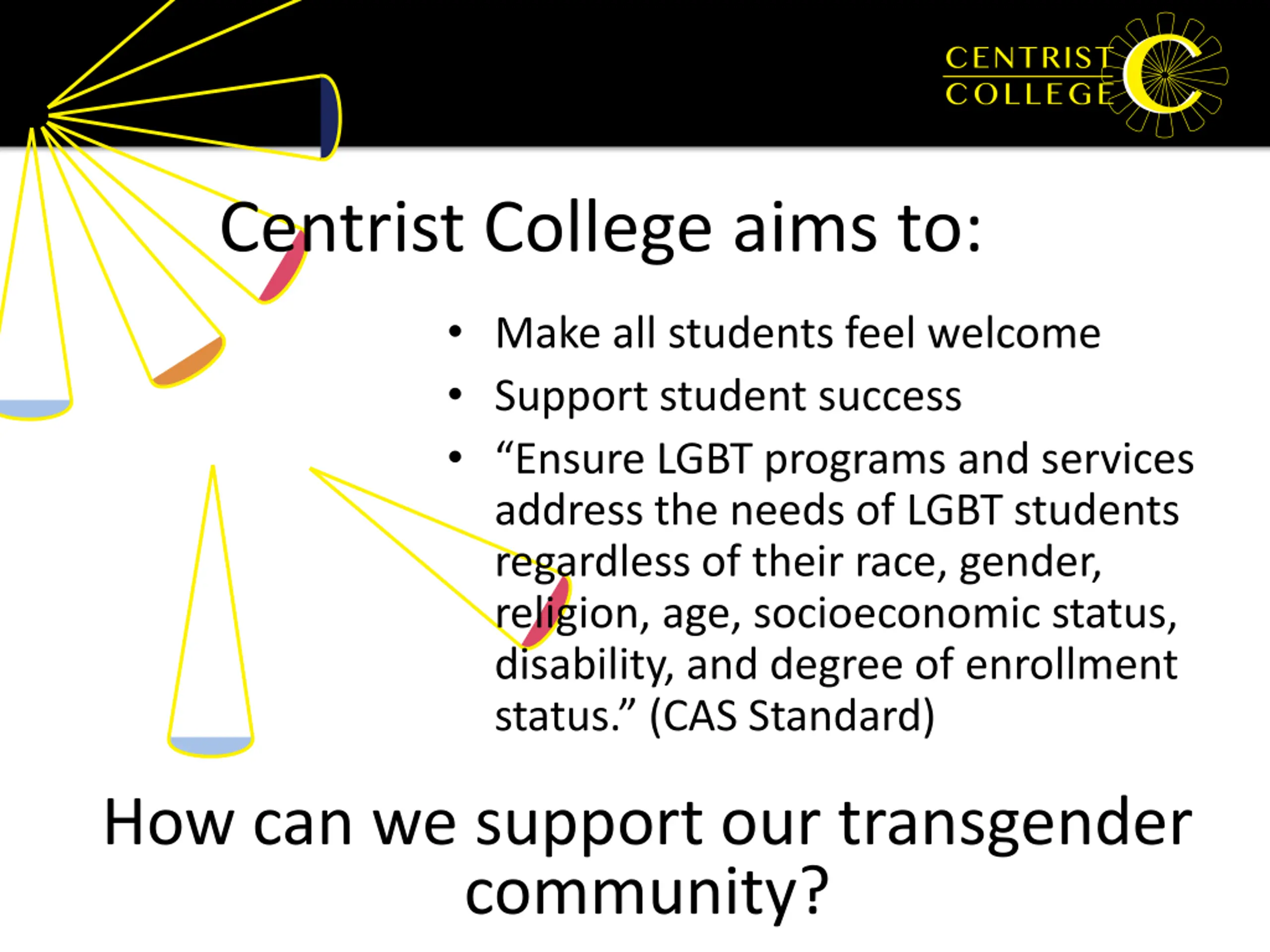 Centrist College aims to: Make all students feel welcome Support student success Ensure LGBT programs and services address the needs of LGBT students regardless of their race, gender, religion, age, socioeconomic status, disability, and degree of enrollment status. (CAS Standard) How can we support our transgender community?