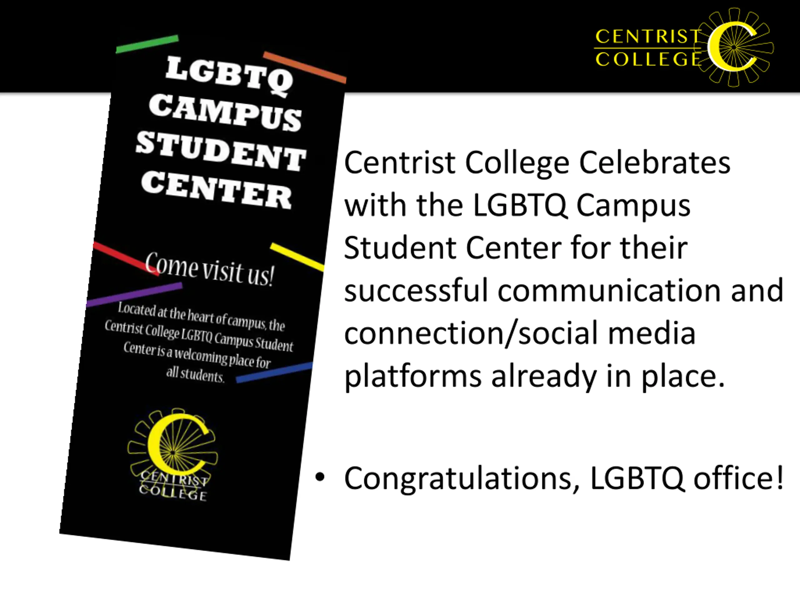 Centrist College Celebrates with the LGBTQ Campus Student Center for their successful communication and connection/social media platforms already in place. Congratulations, LGBTQ office!
