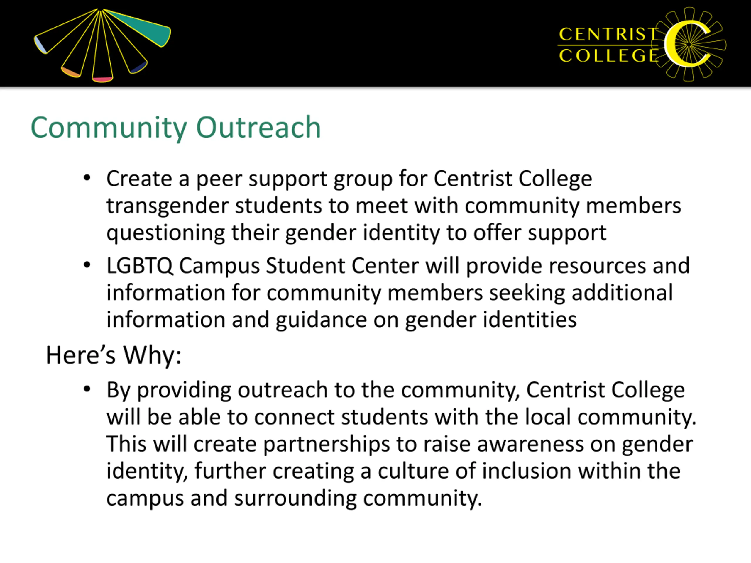 Community Outreach Create a peer support group for Centrist College transgender students to meet with community members questioning their gender identity to offer support LGBTQ Campus Student Center will provide resources and information for community members seeking additional information and guidance on gender identities Here s Why: By providing outreach to the community, Centrist College will be able to connect students with the local community. This will create partnerships to raise awareness on gender identity, further creating a culture of inclusion within the campus and surrounding community.