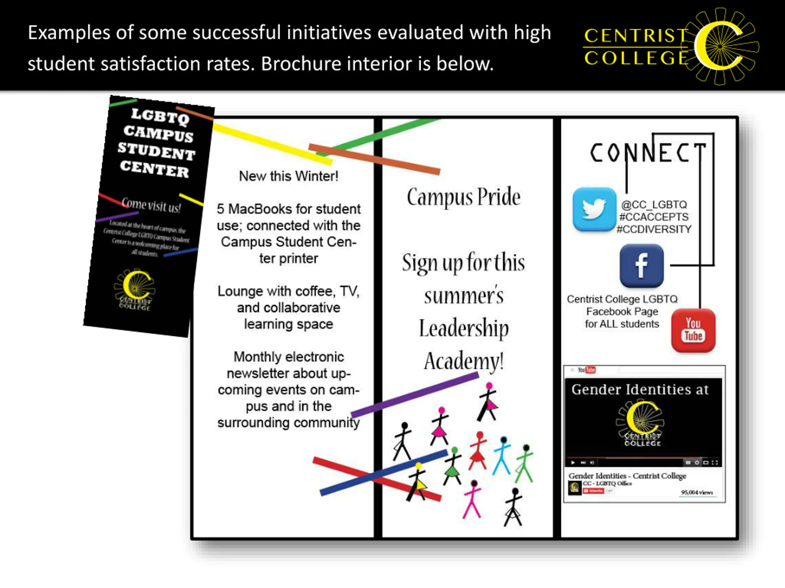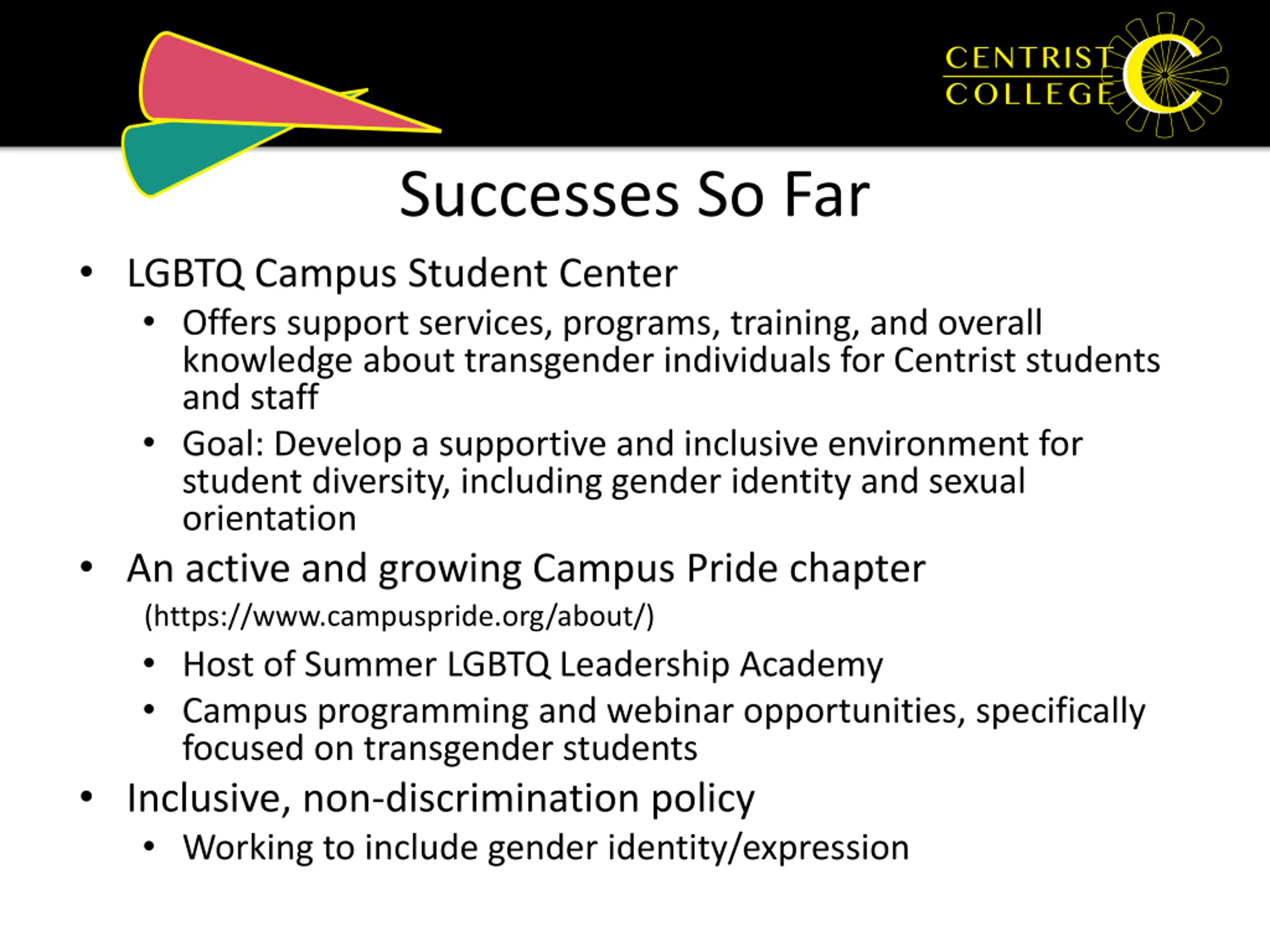 Successes So Far LGBTQ Campus Student Center Offers support services, programs, training, and overall knowledge about transgender individuals for Centrist students and staff Goal: Develop a supportive and inclusive environment for student diversity, including gender identity and sexual orientation An active and growing Campus Pride chapter (https://www.campuspride.org/about/) Host of Summer LGBTQ Leadership Academy Campus programming and webinar opportunities, specifically focused on transgender students Inclusive, non-discrimination policy Working to include gender identity/expression