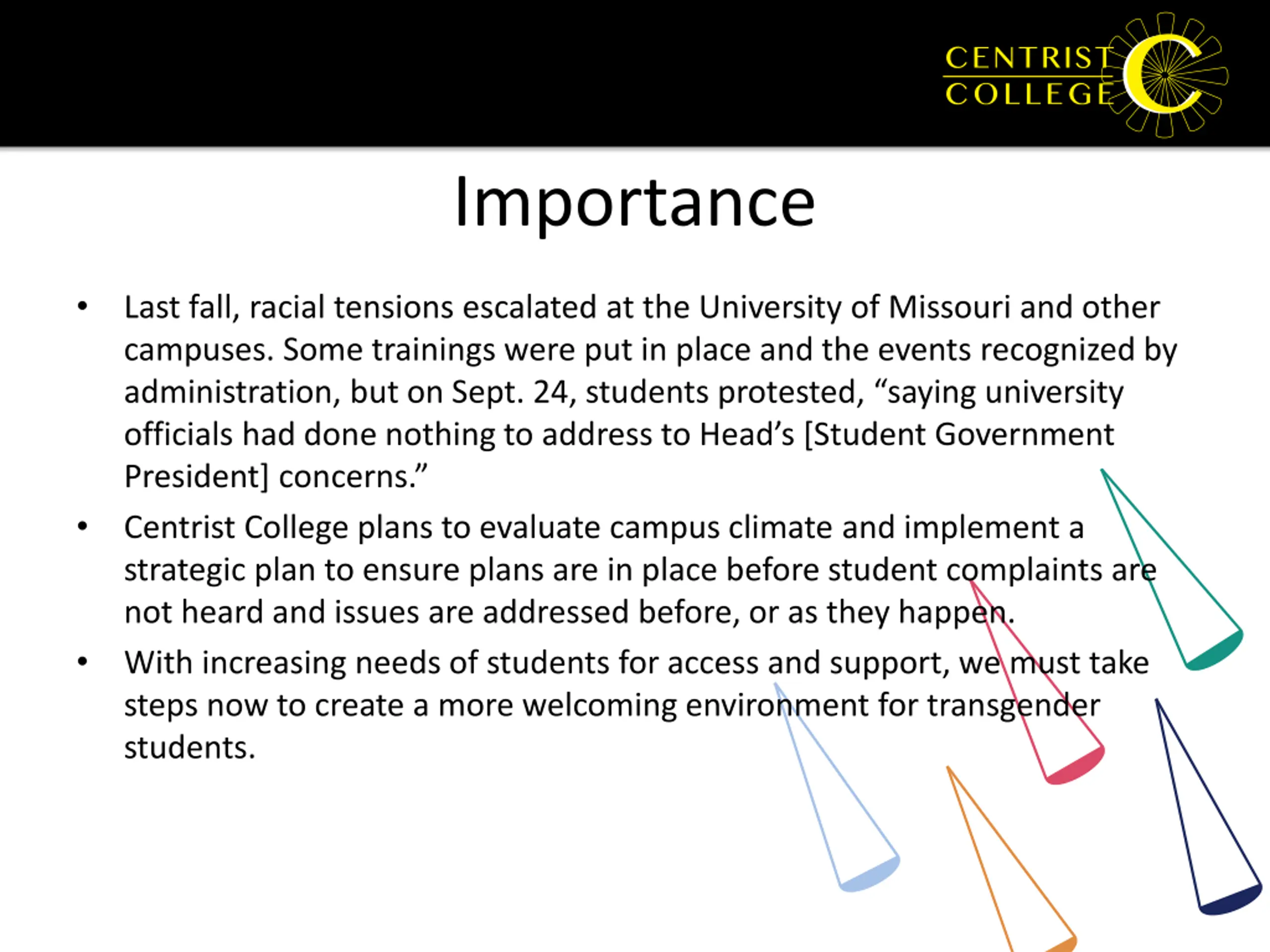 Importance Last fall, racial tensions escalated at the University of Missouri and other campuses. Some trainings were put in place and the events recognized by administration, but on Sept. 24, students protested, saying university officials had done nothing to address to Head s [Student Government President] concerns. Centrist College plans to evaluate campus climate and implement a strategic plan to ensure plans are in place before student complaints are not heard and issues are addressed before, or as they happen. With increasing needs of students for access and support, we must take steps now to create a more welcoming environment for transgender students.