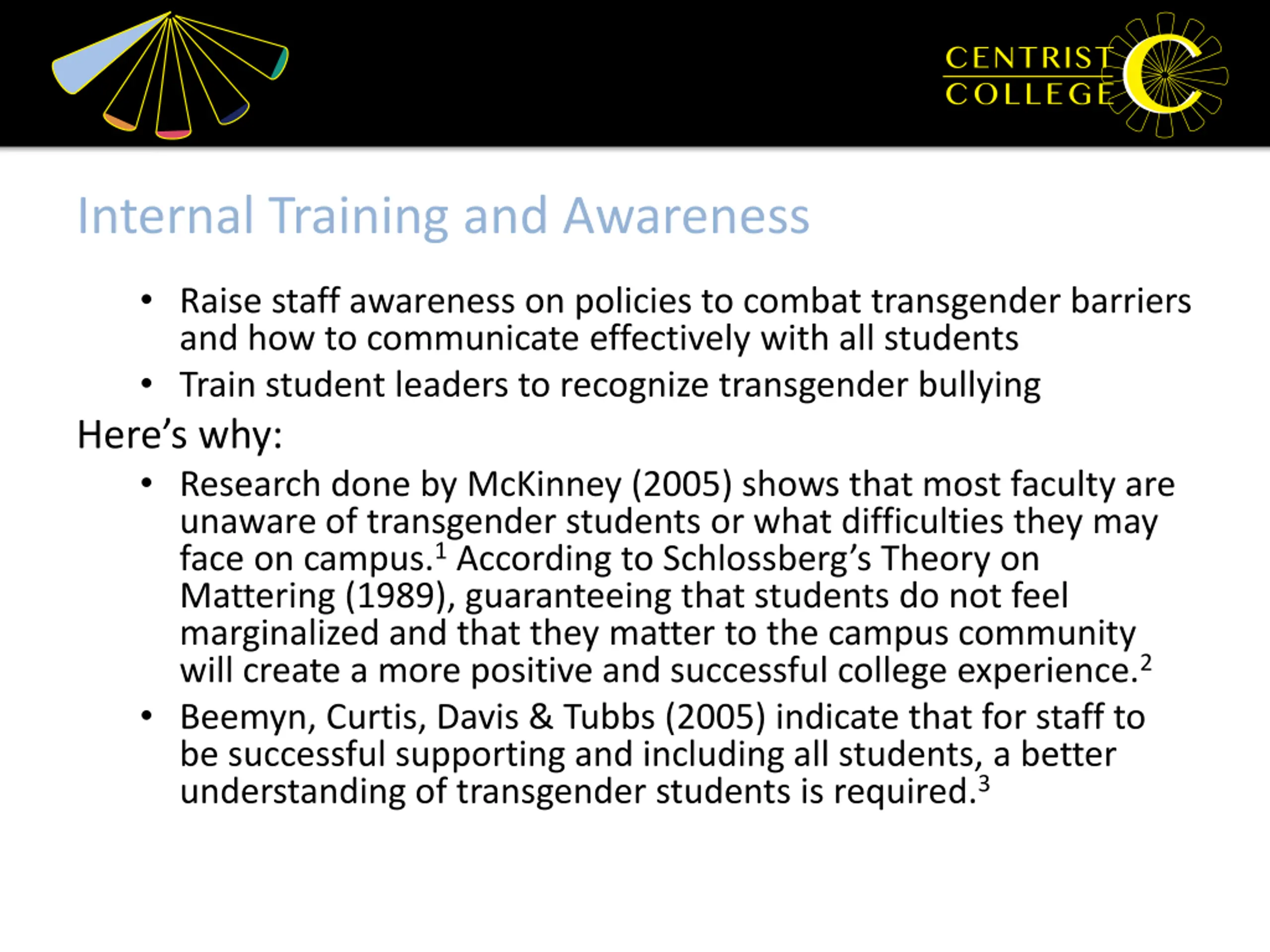 Internal Training and Awareness Raise staff awareness on policies to combat transgender barriers and how to communicate effectively with all students Train student leaders to recognize transgender bullying Here s why: Research done by McKinney (2005) shows that most faculty are unaware of transgender students or what difficulties they may face on campus.1According to Schlossberg s Theory on Mattering (1989), guaranteeing that students do not feel marginalized and that they matter to the campus community will create a more positive and successful college experience.2 Beemyn, Curtis, Davis & Tubbs (2005) indicate that for staff to be successful supporting and including all students, a better understanding of transgender students is required.3