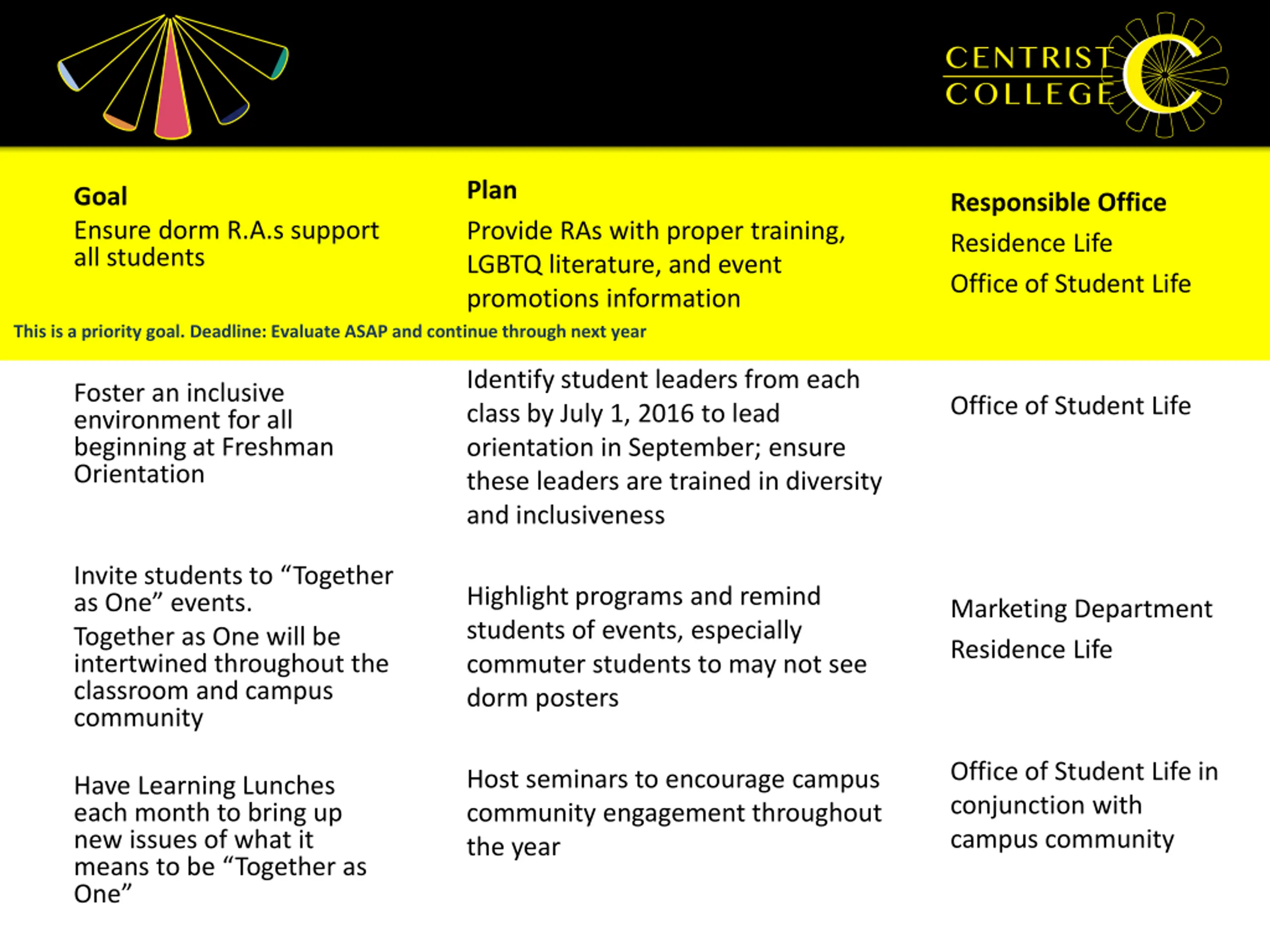 Plan Provide RAs with proper training, LGBTQ literature, and event promotions information Goal Ensure dorm R.A.s support all students Responsible Office Residence Life Office of Student Life This is a priority goal. Deadline: Evaluate ASAP and continue through next year Identify student leaders from each class by July 1, 2016 to lead orientation in September; ensure these leaders are trained in diversity and inclusiveness Foster an inclusive environment for all beginning at Freshman Orientation Office of Student Life Invite students to Together as One events. Together as One will be intertwined throughout the classroom and campus community Highlight programs and remind students of events, especially commuter students to may not see dorm posters Marketing Department Residence Life Office of Student Life in conjunction with campus community Host seminars to encourage campus community engagement throughout the year Have Learning Lunches each month to bring up new issues of what it means to be Together as One