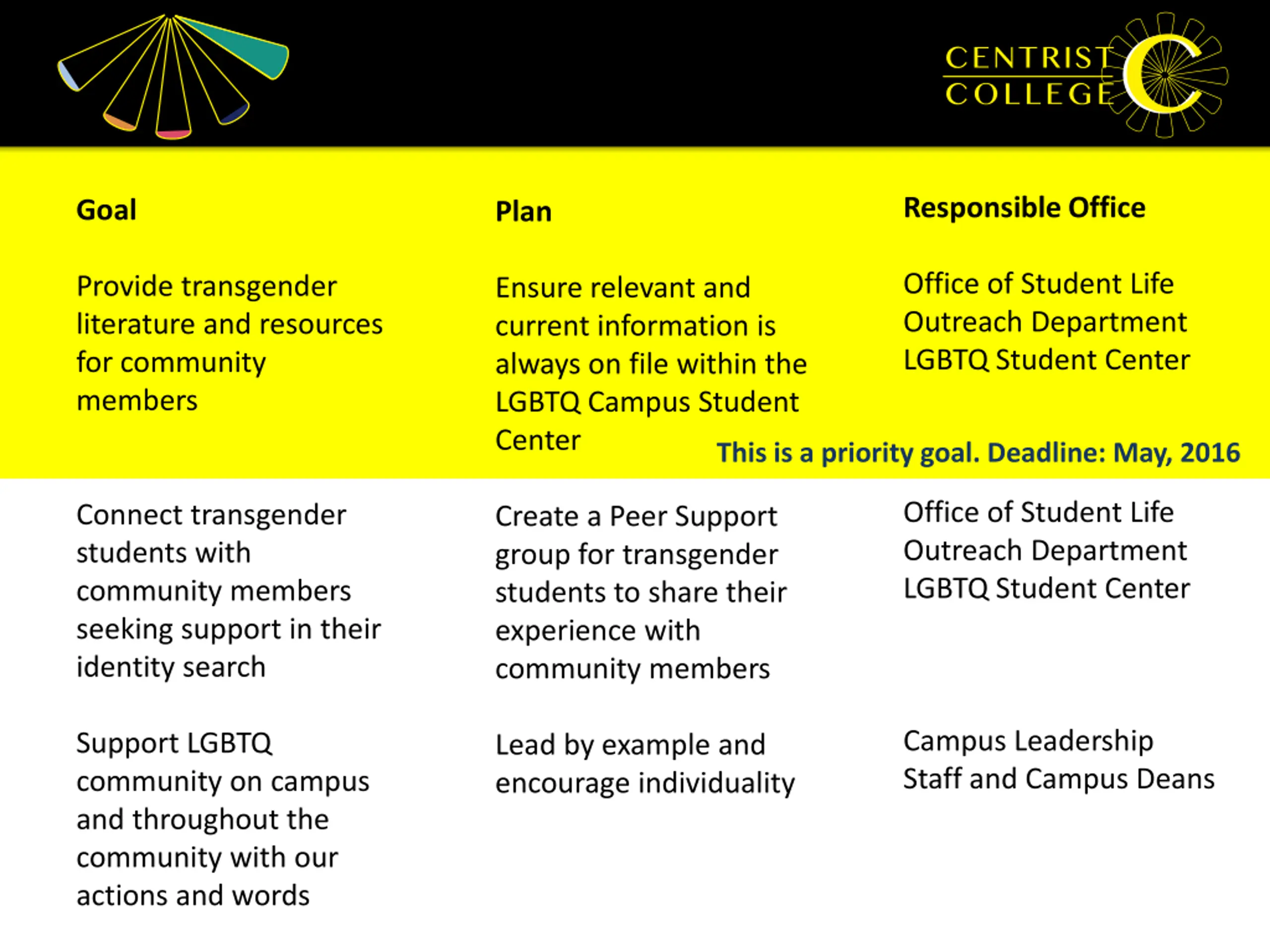 Responsible Office Goal Plan Office of Student Life Outreach Department LGBTQ Student Center Provide transgender literature and resources for community members Ensure relevant and current information is always on file within the LGBTQ Campus Student Center This is a priority goal. Deadline: May, 2016 Office of Student Life Outreach Department LGBTQ Student Center Connect transgender students with community members seeking support in their identity search Create a Peer Support group for transgender students to share their experience with community members Campus Leadership Staff and Campus Deans Support LGBTQ community on campus and throughout the community with our actions and words Lead by example and encourage individuality