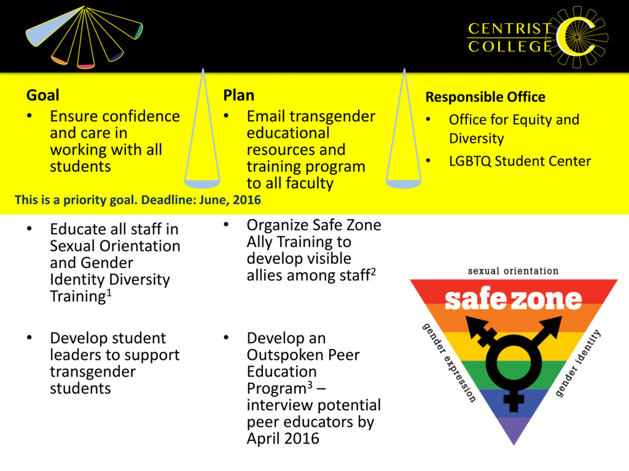 Goal Plan Responsible Office Office for Equity and Diversity LGBTQ Student Center Ensure confidence and care in working with all students Email transgender educational resources and training program to all faculty This is a priority goal. Deadline: June, 2016 Organize Safe Zone Ally Training to develop visible allies among staff2 Educate all staff in Sexual Orientation and Gender Identity Diversity Training1 Develop student leaders to support transgender students Develop an Outspoken Peer Education Program3 interview potential peer educators by April 2016