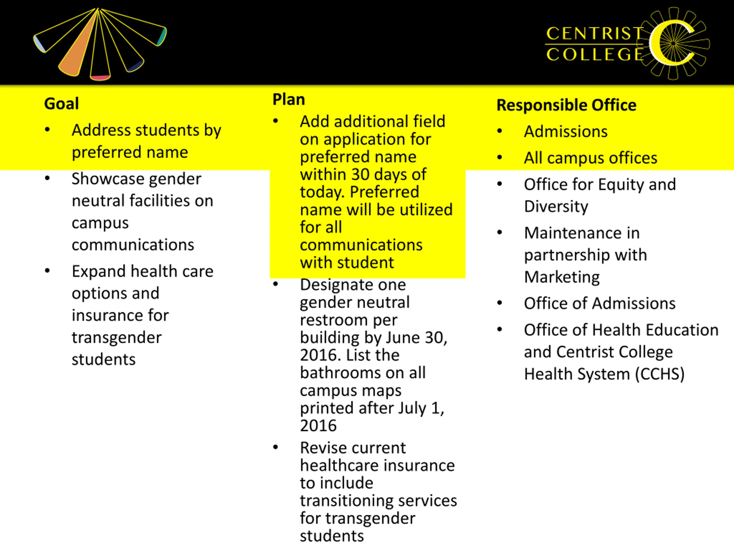 Plan Goal Responsible Office Admissions All campus offices Office for Equity and Diversity Maintenance in partnership with Marketing Office of Admissions Office of Health Education and Centrist College Health System (CCHS) Add additional field on application for preferred name within 30 days of today. Preferred name will be utilized for all communications with student Designate one gender neutral restroom per building by June 30, 2016. List the bathrooms on all campus maps printed after July 1, 2016 Revise current healthcare insurance to include transitioning services for transgender students Address students by preferred name Showcase gender neutral facilities on campus communications Expand health care options and insurance for transgender students