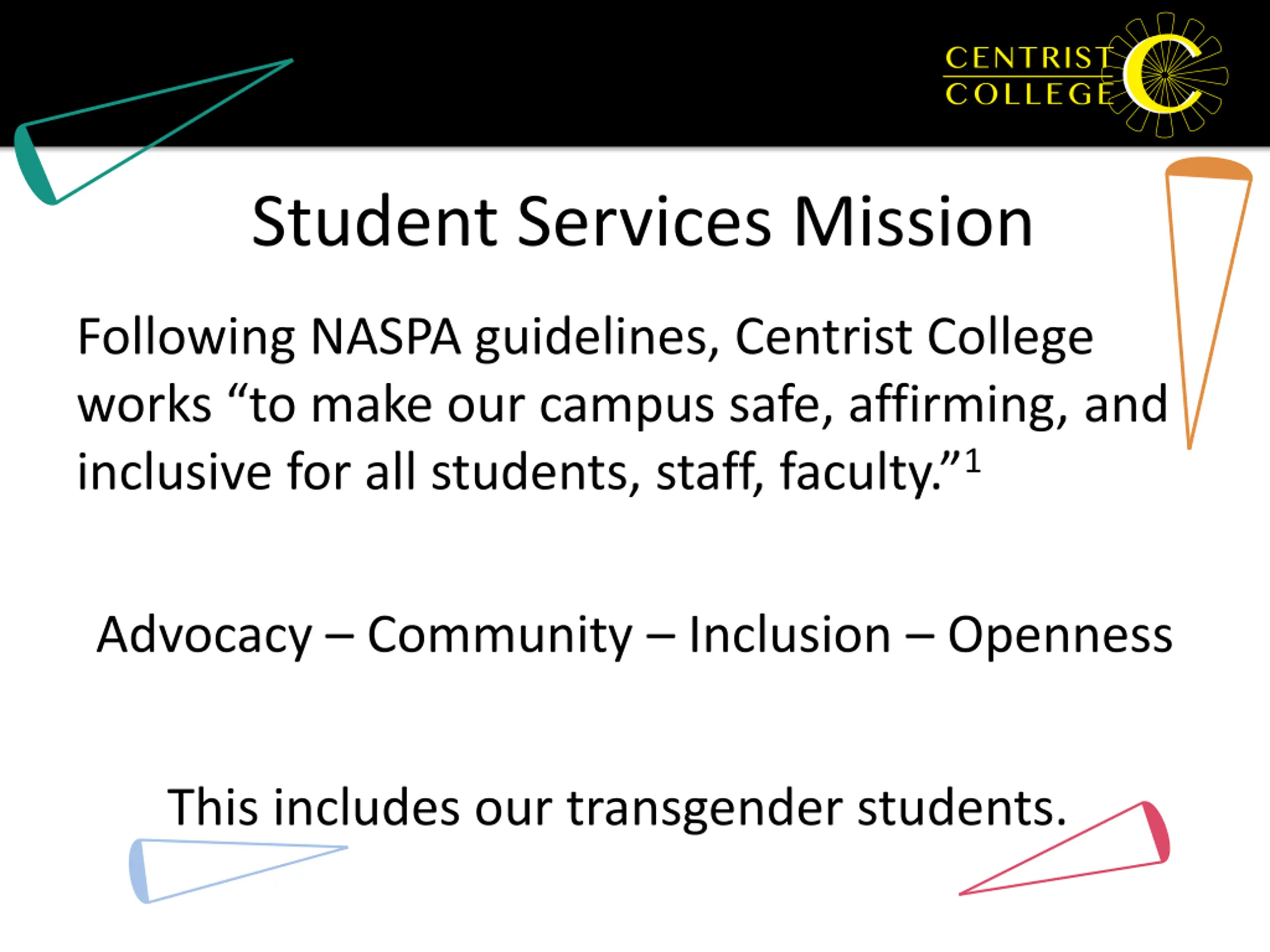 Student Services Mission Following NASPA guidelines, Centrist College works to make our campus safe, affirming, and inclusive for all students, staff, faculty. 1 Advocacy Community Inclusion Openness This includes our transgender students.