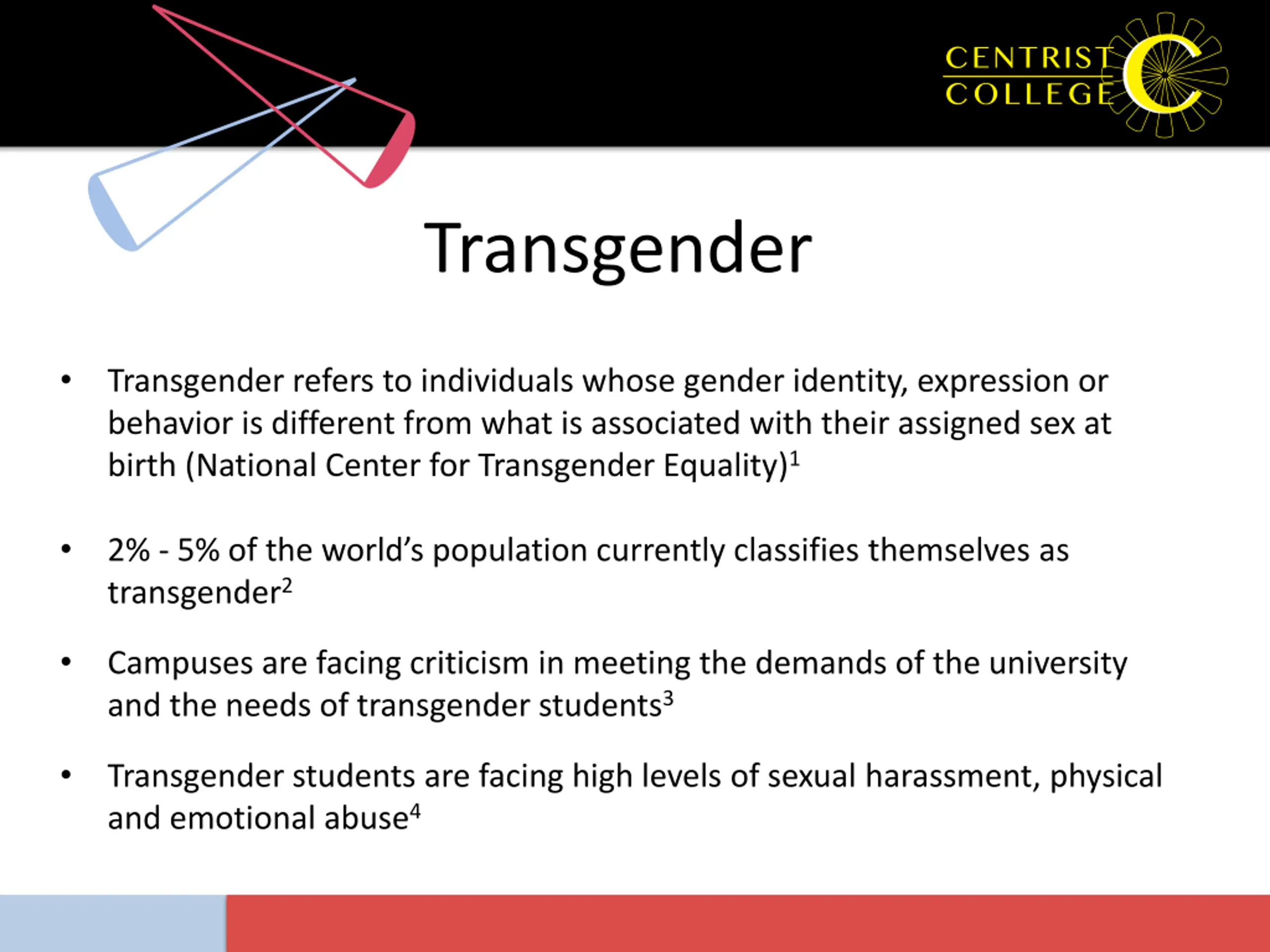 Transgender Transgender refers to individuals whose gender identity, expression or behavior is different from what is associated with their assigned sex at birth (National Center for Transgender Equality)1 2% - 5% of the world s population currently classifies themselves as transgender2 Campuses are facing criticism in meeting the demands of the university and the needs of transgender students3 Transgender students are facing high levels of sexual harassment, physical and emotional abuse4