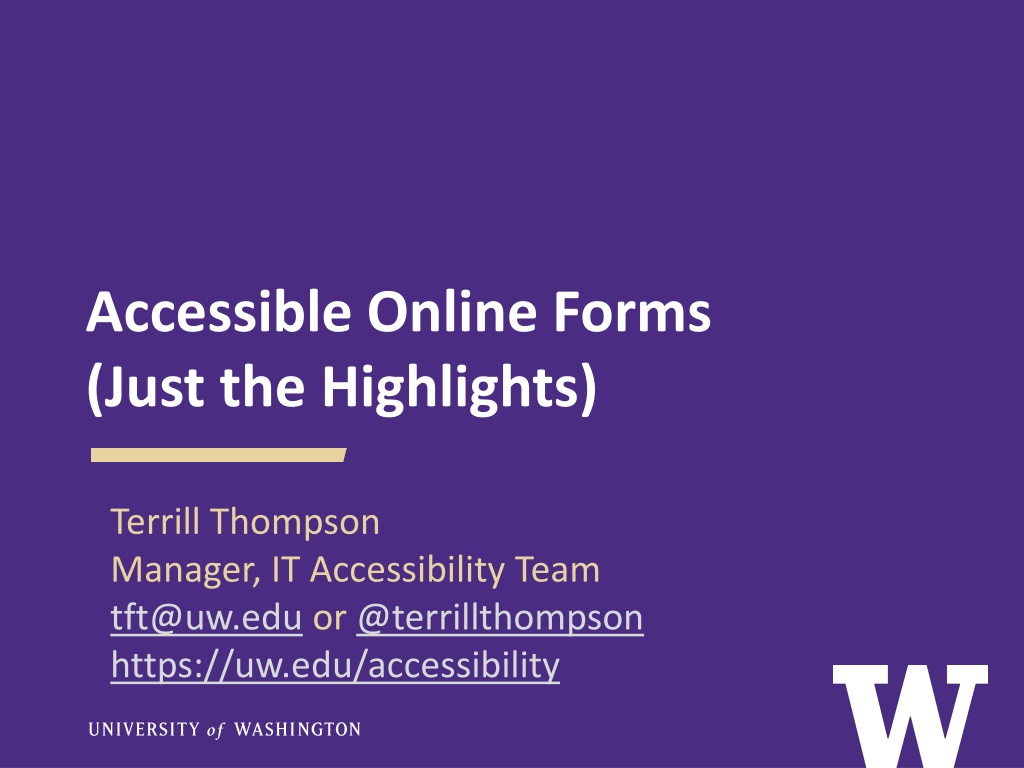 Accessible Online Forms (Just the Highlights) Terrill Thompson Manager, IT Accessibility Team tft@uw.edu or @terrillthompson https://uw.edu/accessibility