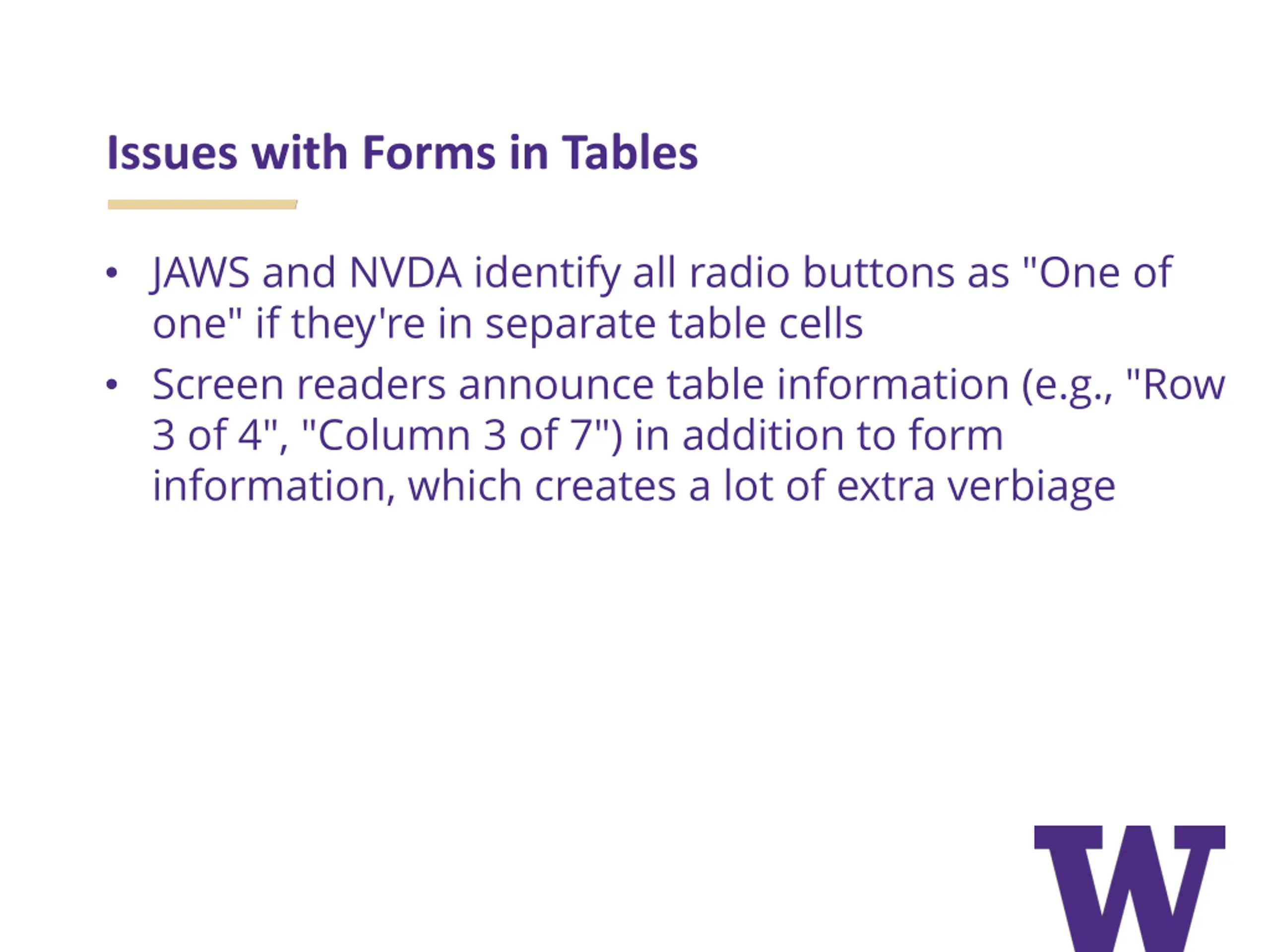 Issues with Forms in Tables JAWS and NVDA identify all radio buttons as "One of one" if they're in separate table cells Screen readers announce table information (e.g., "Row 3 of 4", "Column 3 of 7") in addition to form information, which creates a lot of extra verbiage