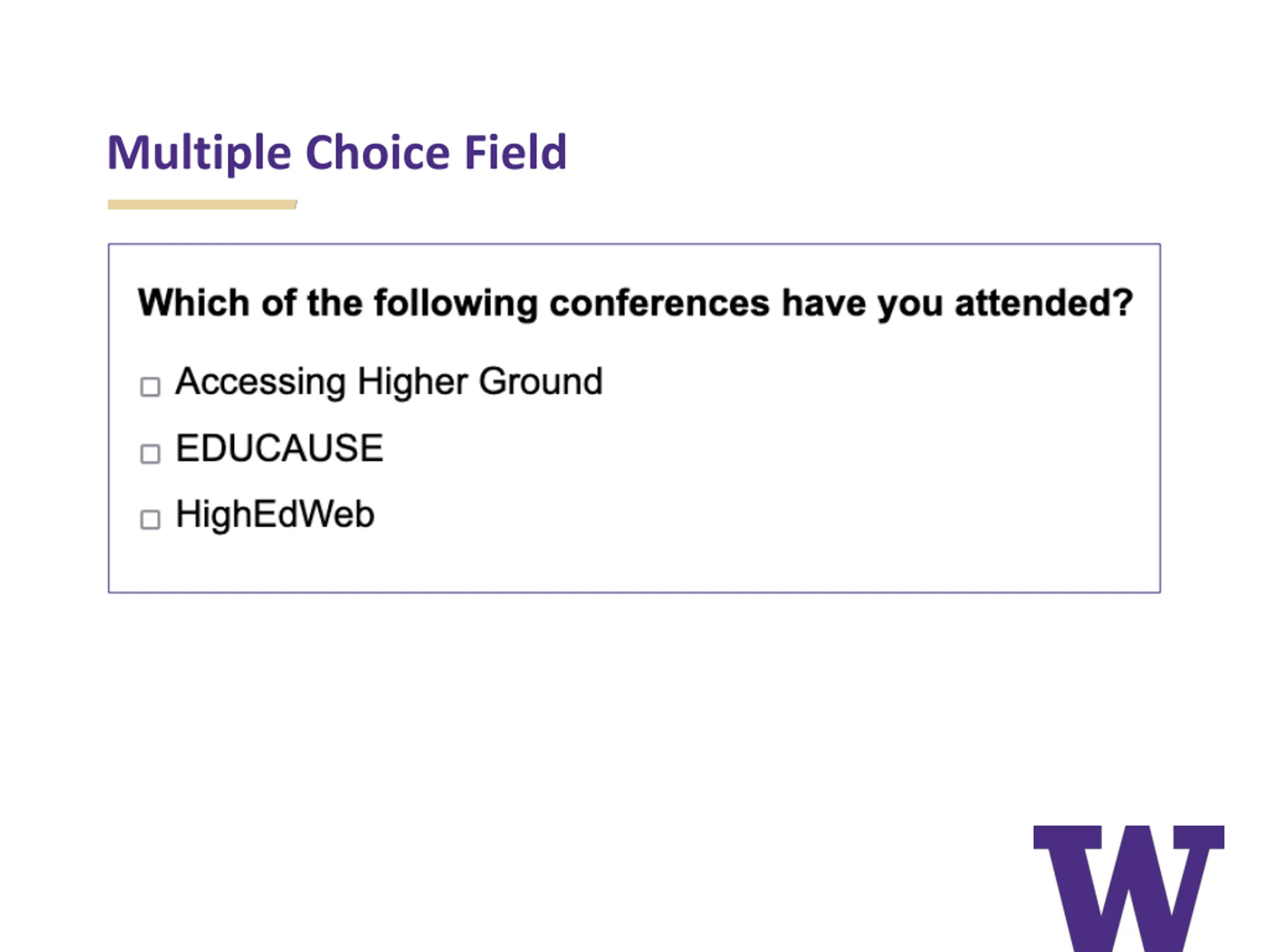 Multiple Choice Field (Code) <fieldset> <legend>Which of the following conferences have you attended?</legend> <div> <input type="checkbox" name="conf1" id="c1"> <label for="c1">Accessing Higher Ground</label> </div> <div> <input type="checkbox" name="conf2" id="c2"> <label for="c2">EDUCAUSE</label> </div> <div> <input type="checkbox" name="conf3" id="c3"> <label for="c3">Accessing Higher Ground</label> </div> </fieldset>