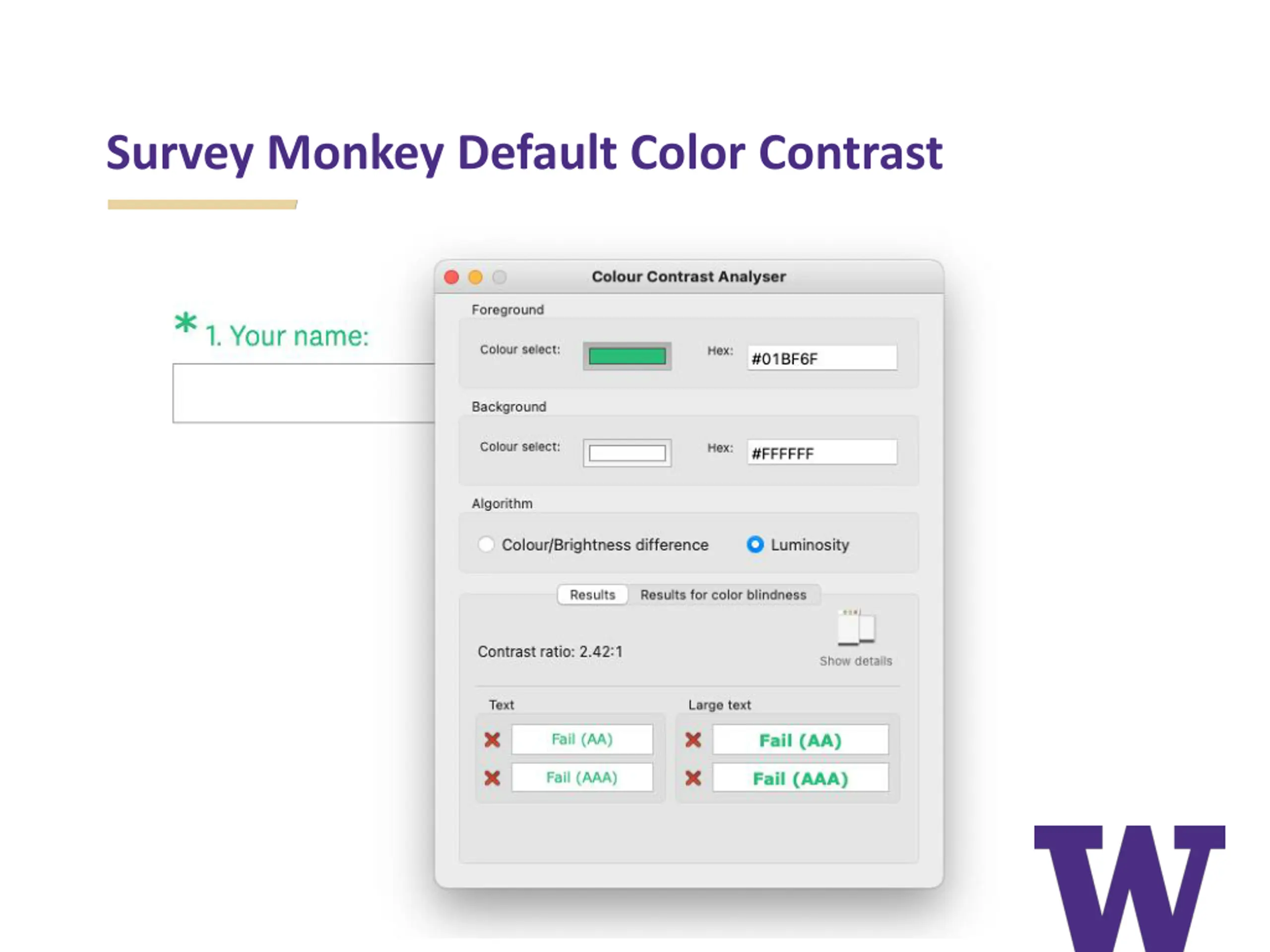 Summary: Survey Tools (2 of 2) Both Qualtrics and Survey Monkey have quirky code, and screen readers are quirky in how they handle it (inconsistent experience when testing with screen readers) In the default Qualtrics theme, there is no visible difference between checkboxes and radio buttons. The default Survey Monkey theme has very low color contrast.