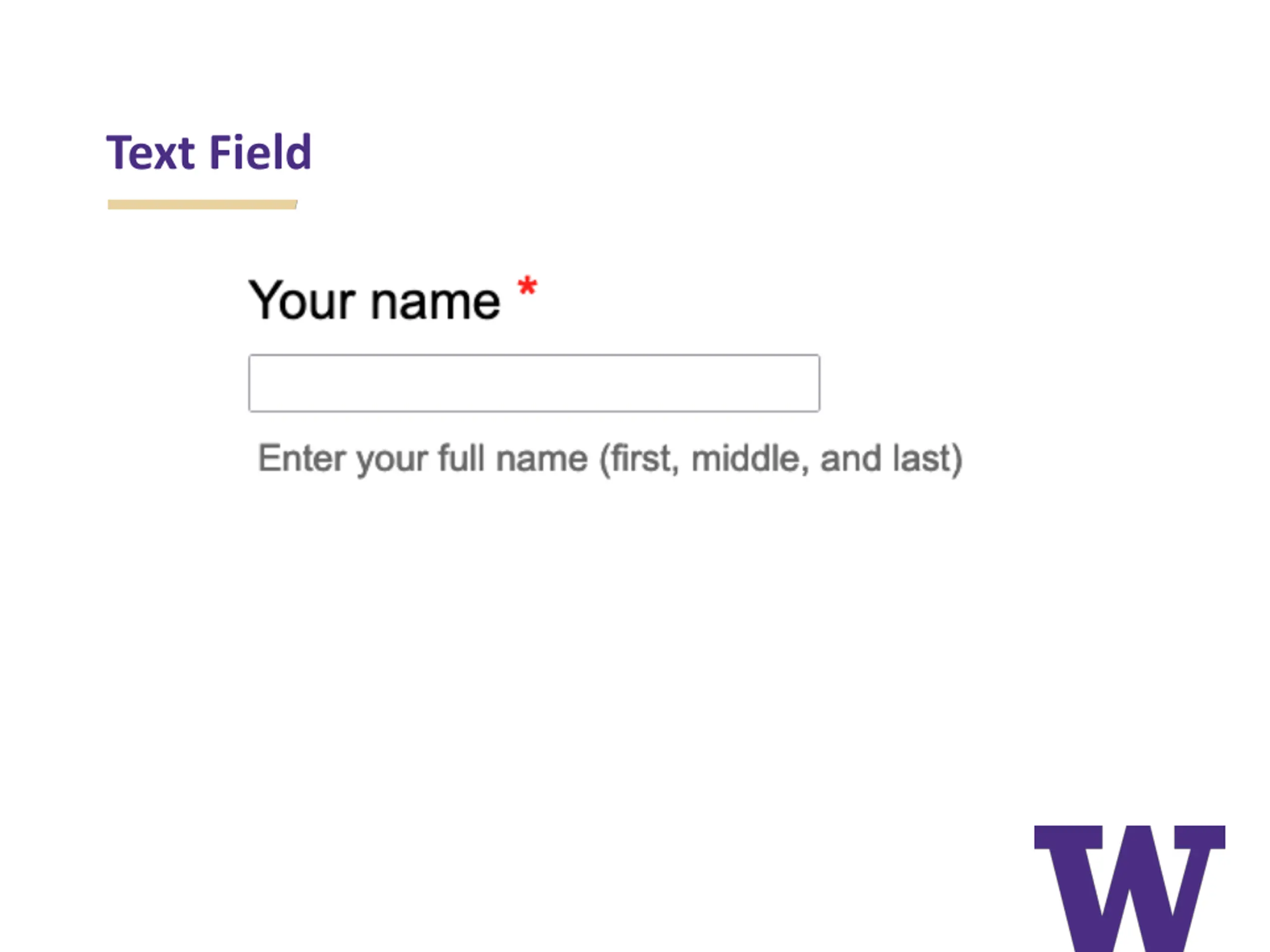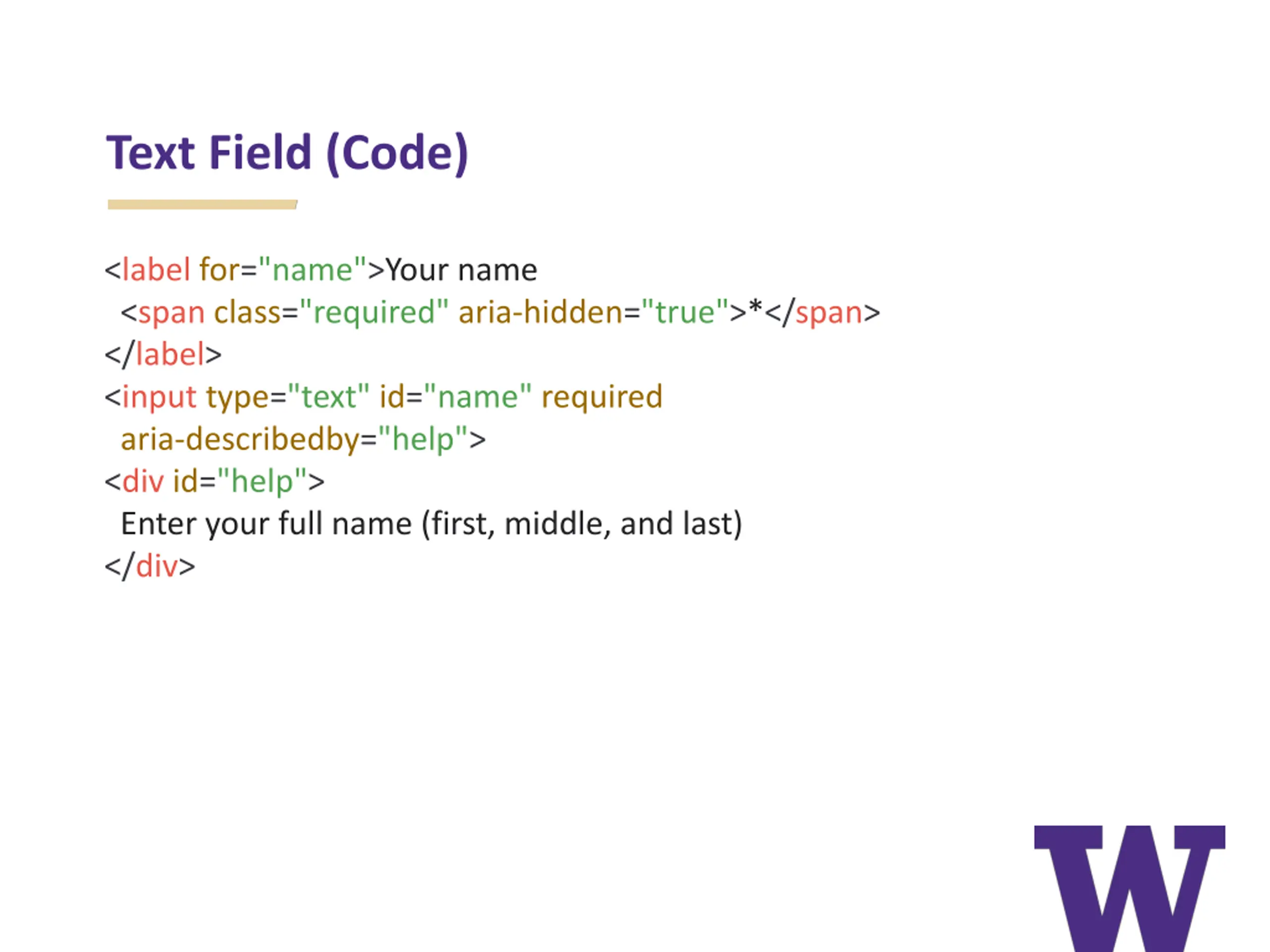 Text Field (Code) <label for="name">Your name <span class="required" aria-hidden="true">*</span> </label> <input type="text" id="name" required aria-describedby="help"> <div id="help"> Enter your full name (first, middle, and last) </div>