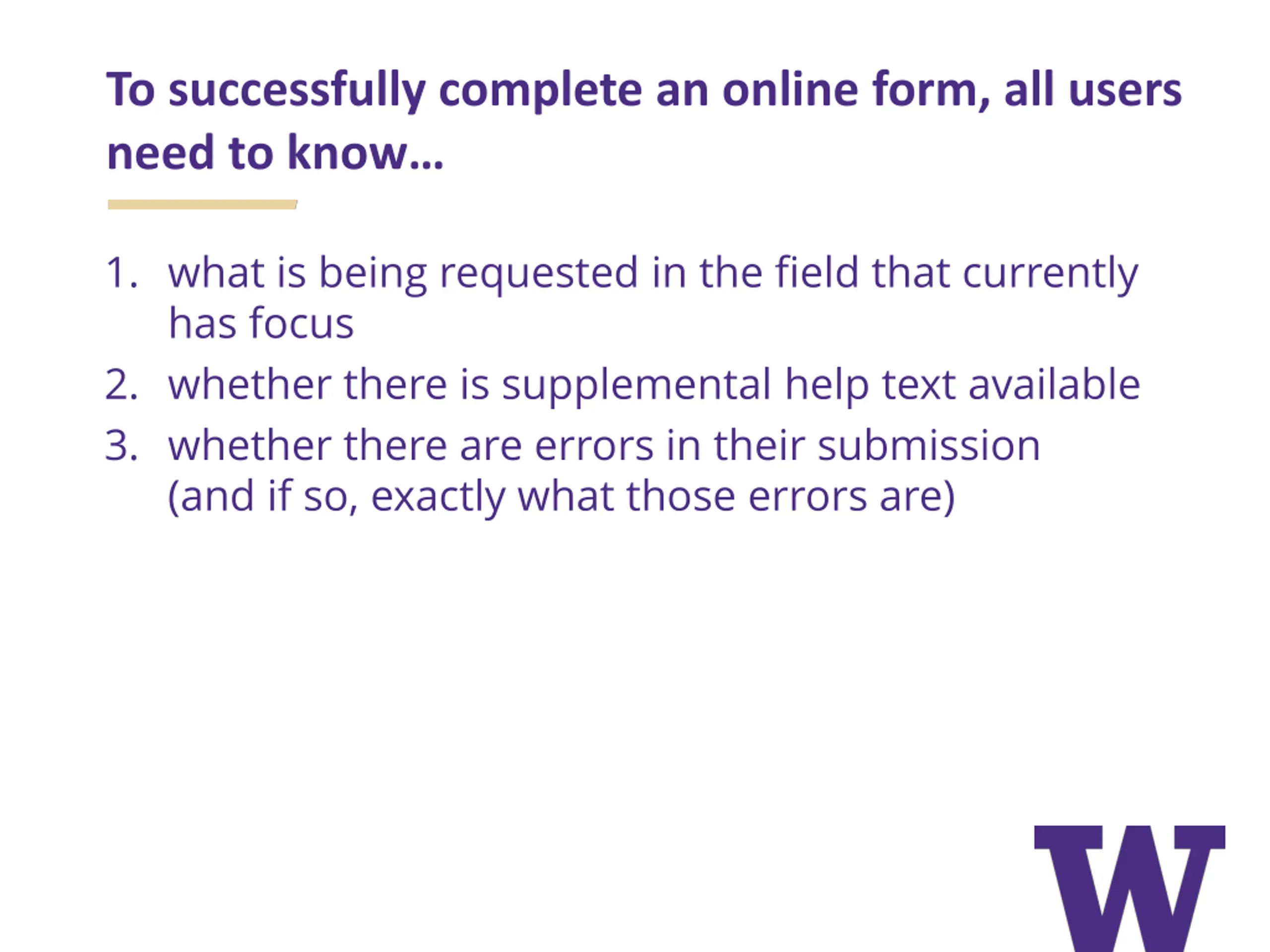 To successfully complete an online form, all users need to know 1. what is being requested in the field that currently has focus 2. whether there is supplemental help text available 3. whether there are errors in their submission (and if so, exactly what those errors are)