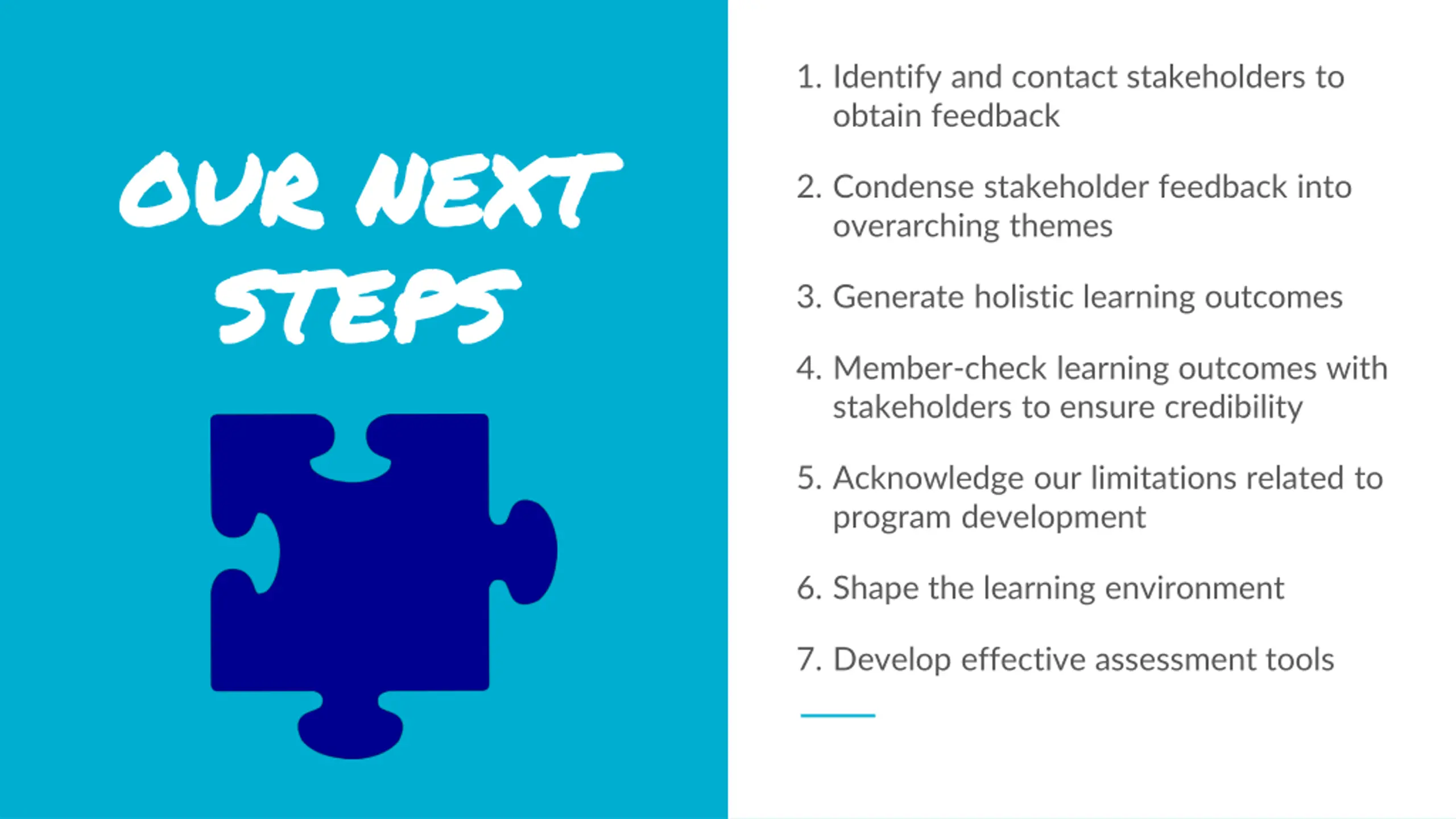 1. Identify and contact stakeholders to obtain feedback OUR NEXT OUR NEXT STEPS STEPS 2. Condense stakeholder feedback into overarching themes 3. Generate holistic learning outcomes 4. Member-check learning outcomes with stakeholders to ensure credibility 5. Acknowledge our limitations related to program development 6. Shape the learning environment 7. Develop effective assessment tools