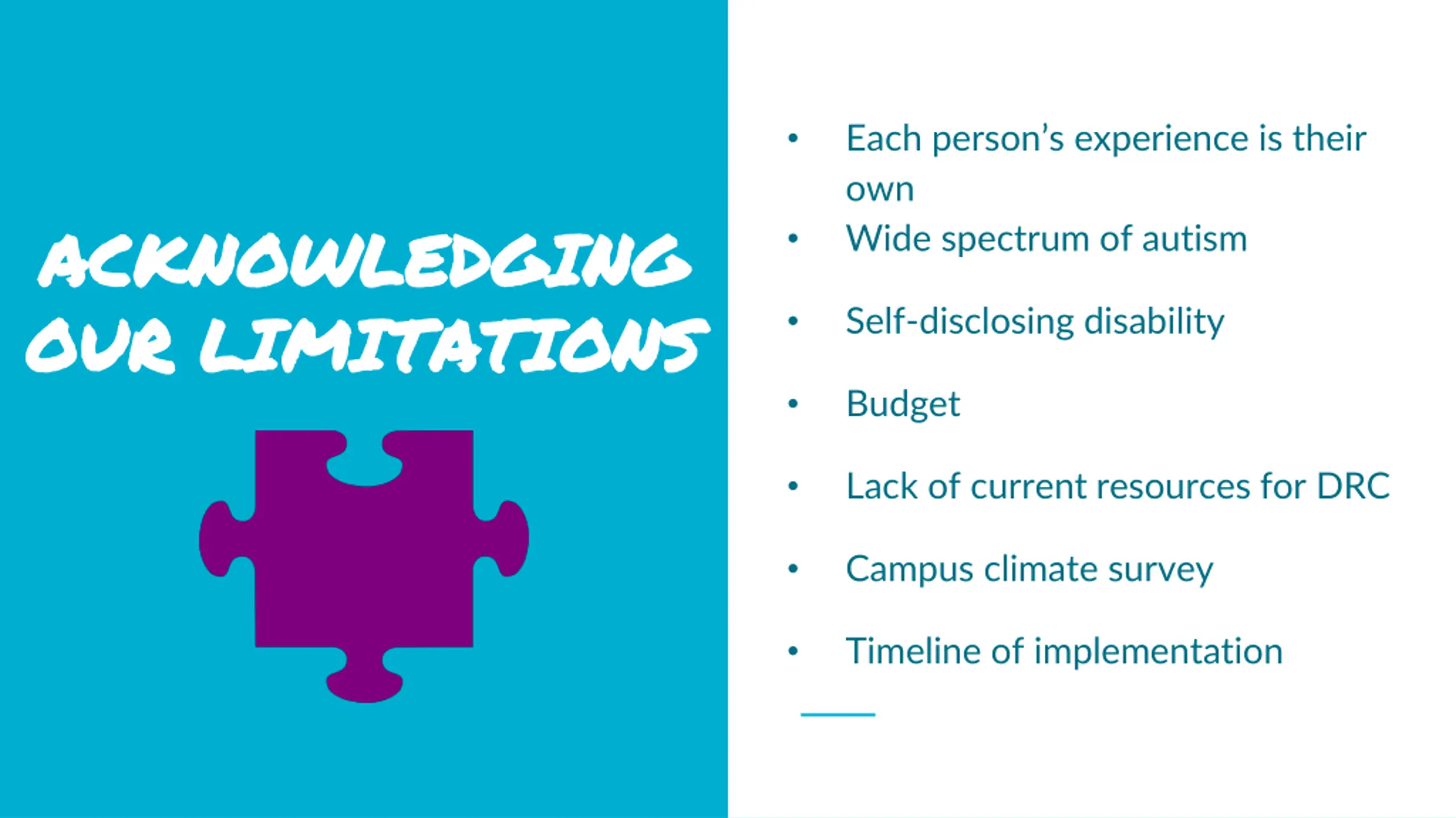 Each persons experience is their own Wide spectrum of autism ACKNOWLEDGING ACKNOWLEDGING OUR LIMITATIONS OUR LIMITATIONS Self-disclosing disability Budget Lack of current resources for DRC Campus climate survey Timeline of implementation
