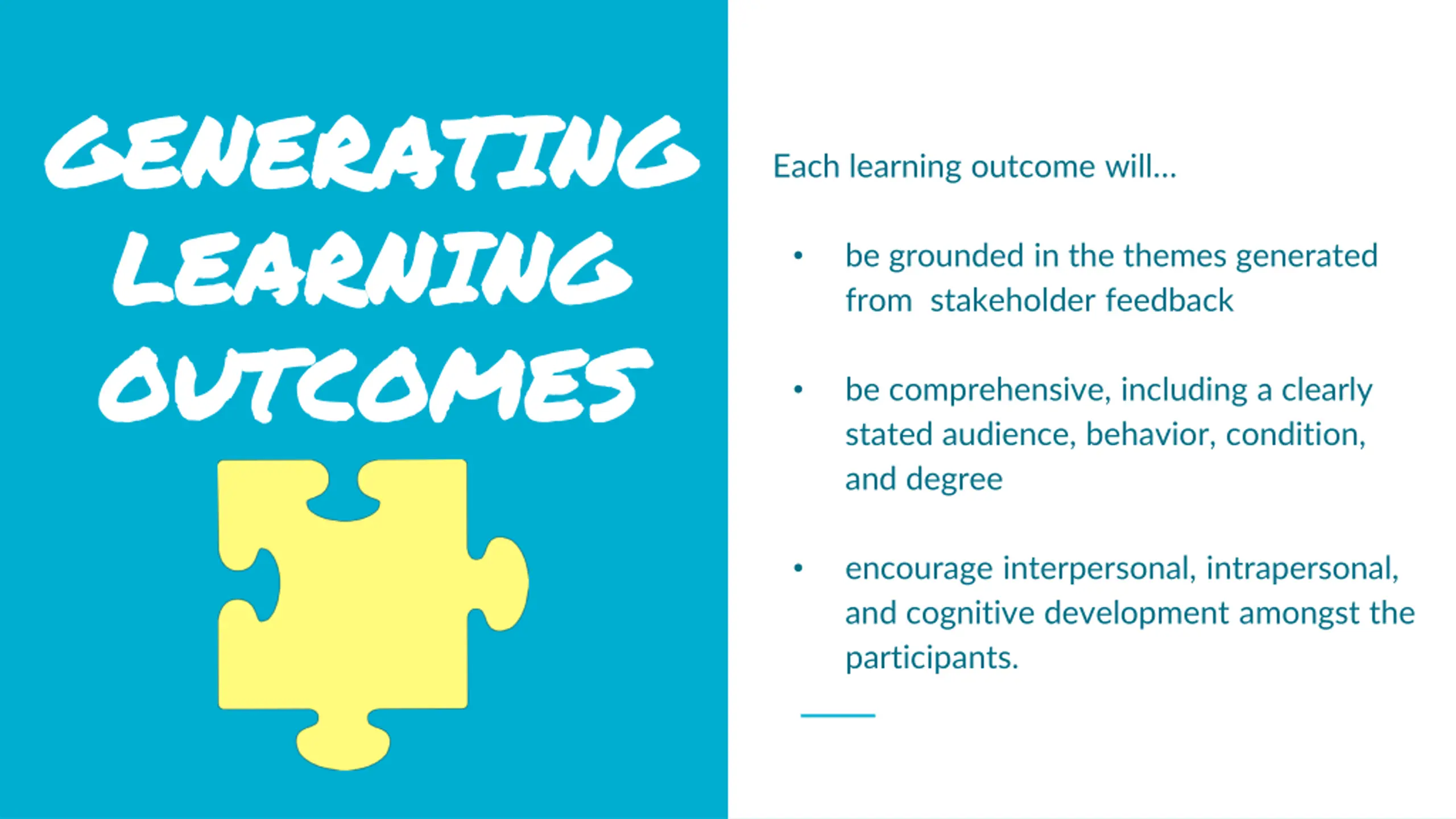 GENERATING GENERATING LEARNING LEARNING OUTCOMES OUTCOMES Each learning outcome will be grounded in the themes generated from stakeholder feedback be comprehensive, including a clearly stated audience, behavior, condition, and degree encourage interpersonal, intrapersonal, and cognitive development amongst the participants.