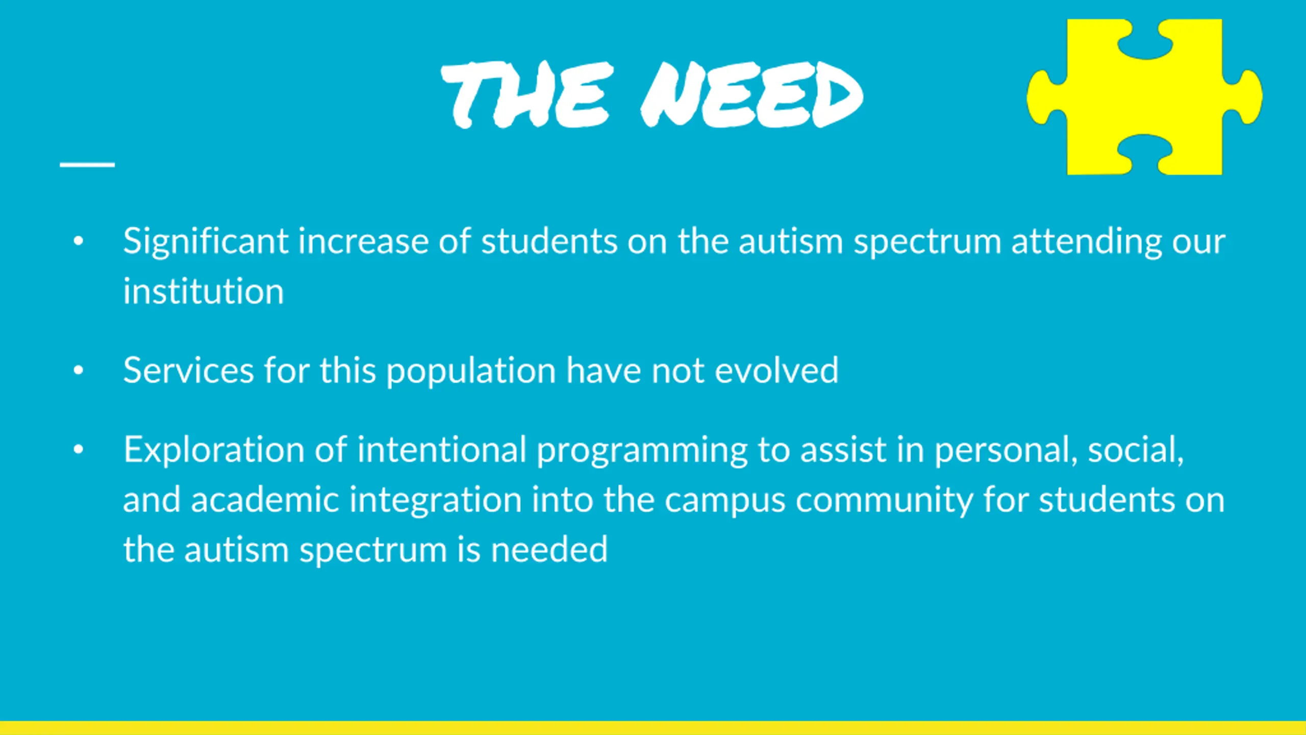 THE NEED THE NEED Significant increase of students on the autism spectrum attending our institution Services for this population have not evolved Exploration of intentional programming to assist in personal, social, and academic integration into the campus community for students on the autism spectrum is needed