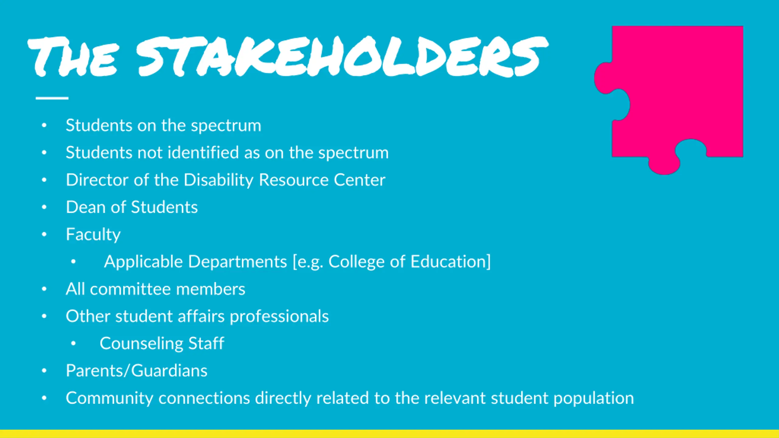 The STAKEHOLDERS The STAKEHOLDERS Students on the spectrum Students not identified as on the spectrum Director of the Disability Resource Center Dean of Students Faculty Applicable Departments [e.g. College of Education] All committee members Other student affairs professionals Counseling Staff Parents/Guardians Community connections directly related to the relevant student population