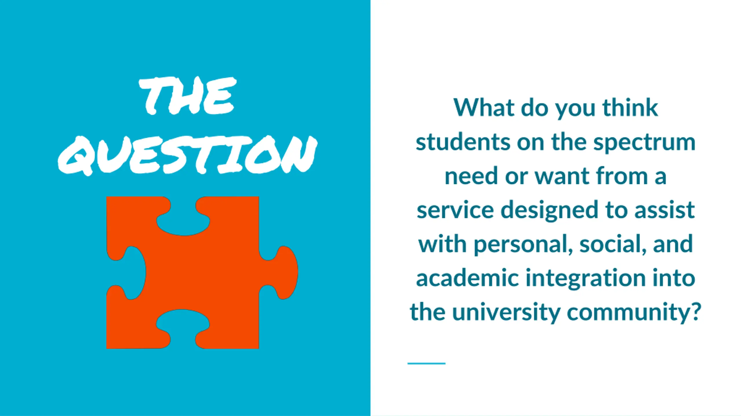THE THE What do you think students on the spectrum need or want from a service designed to assist with personal, social, and academic integration into the university community? QUESTION QUESTION