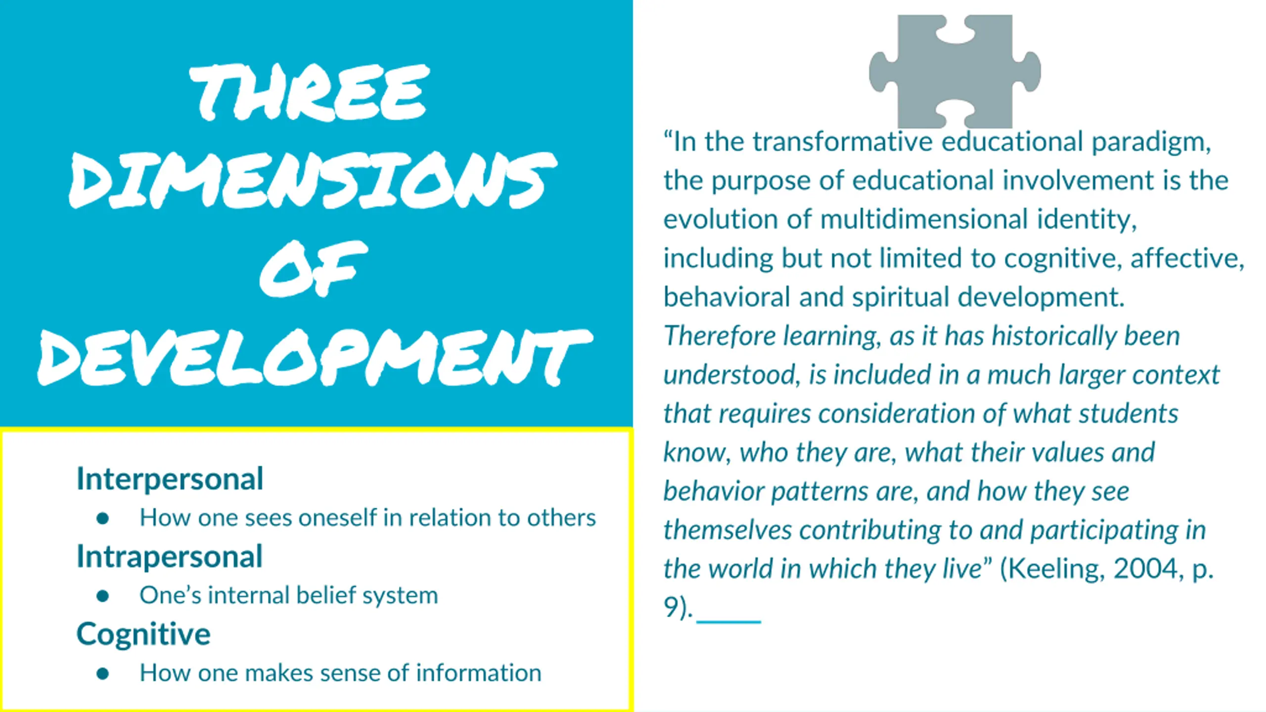 THREE THREE DIMENSIONS DIMENSIONS OF OF DEVELOPMENT DEVELOPMENT In the transformative educational paradigm, the purpose of educational involvement is the evolution of multidimensional identity, including but not limited to cognitive, affective, behavioral and spiritual development. Therefore learning, as it has historically been understood, is included in a much larger context that requires consideration of what students know, who they are, what their values and behavior patterns are, and how they see themselves contributing to and participating in the world in which they live (Keeling, 2004, p. 9). Interpersonal How one sees oneself in relation to others Intrapersonal One s internal belief system Cognitive How one makes sense of information
