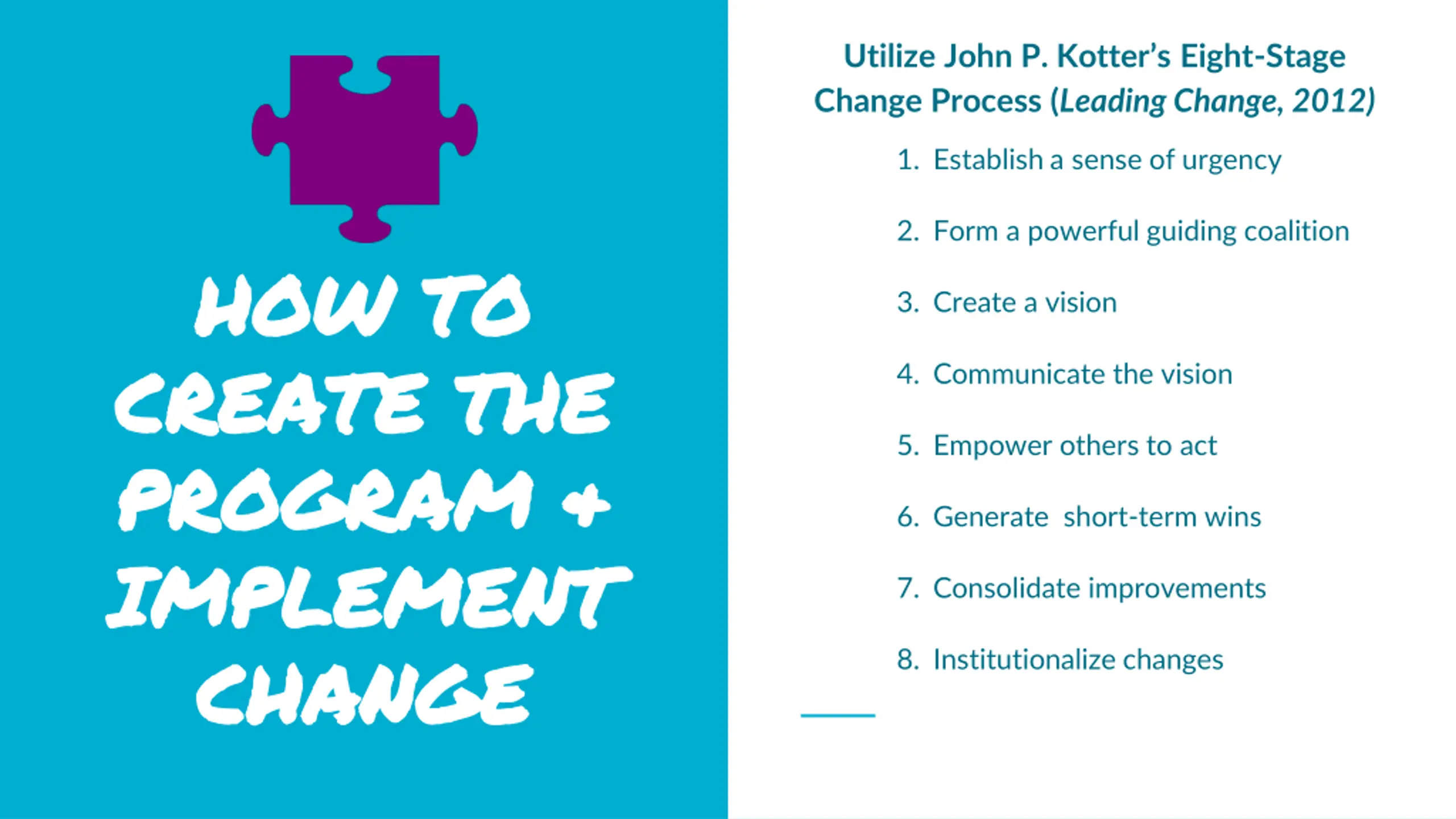 Utilize John P. Kotters Eight-Stage Change Process (Leading Change, 2012) 1. Establish a sense of urgency 2. Form a powerful guiding coalition HOW TO HOW TO CREATE THE CREATE THE PROGRAM & PROGRAM & IMPLEMENT IMPLEMENT CHANGE CHANGE 3. Create a vision 4. Communicate the vision 5. Empower others to act 6. Generate short-term wins 7. Consolidate improvements 8. Institutionalize changes