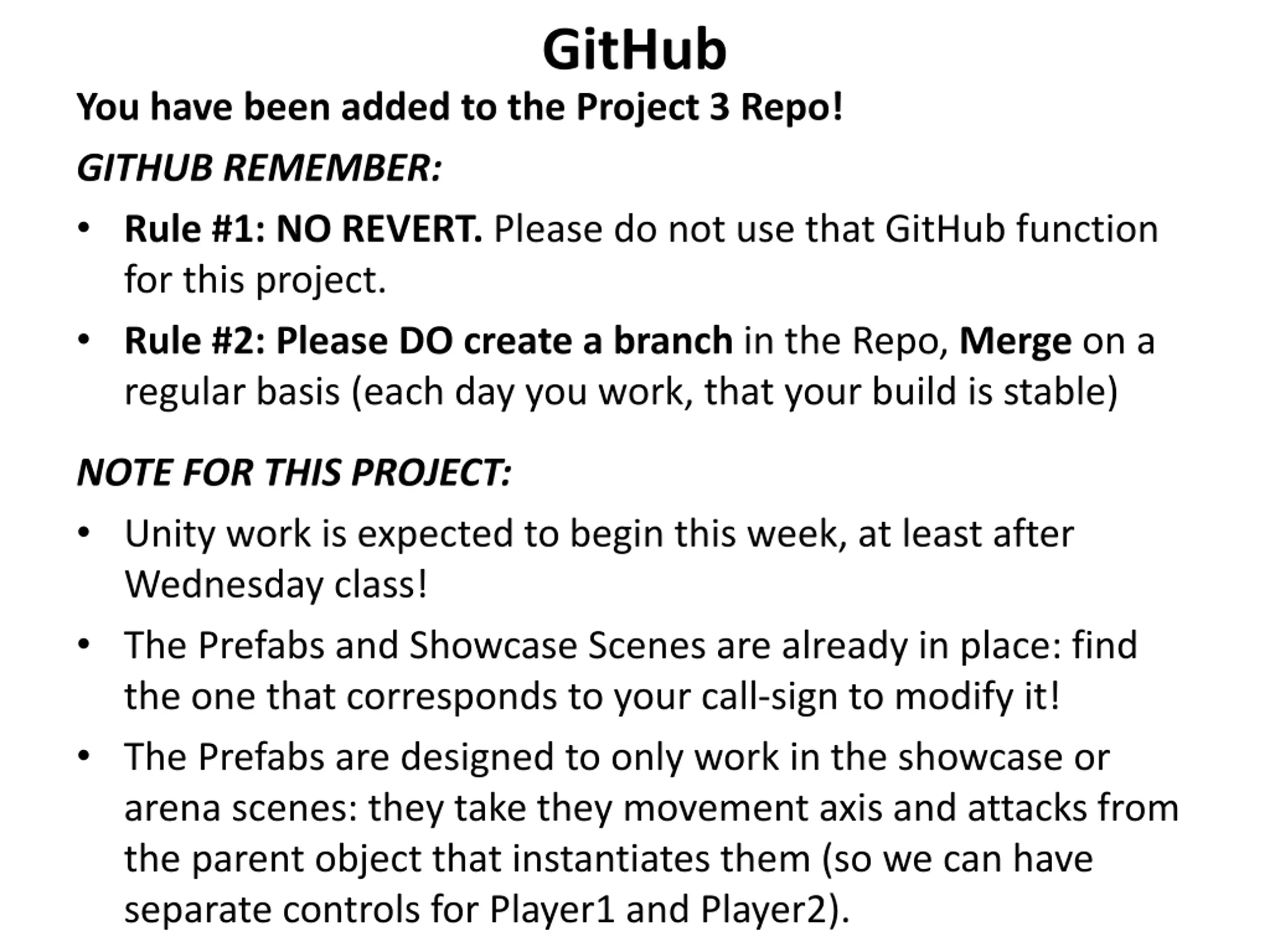GitHub You have been added to the Project 3 Repo! GITHUB REMEMBER: Rule #1: NO REVERT. Please do not use that GitHub function for this project. Rule #2: Please DO create a branch in the Repo, Merge on a regular basis (each day you work, that your build is stable) NOTE FOR THIS PROJECT: Unity work is expected to begin this week, at least after Wednesday class! The Prefabs and Showcase Scenes are already in place: find the one that corresponds to your call-sign to modify it! The Prefabs are designed to only work in the showcase or arena scenes: they take they movement axis and attacks from the parent object that instantiates them (so we can have separate controls for Player1 and Player2).