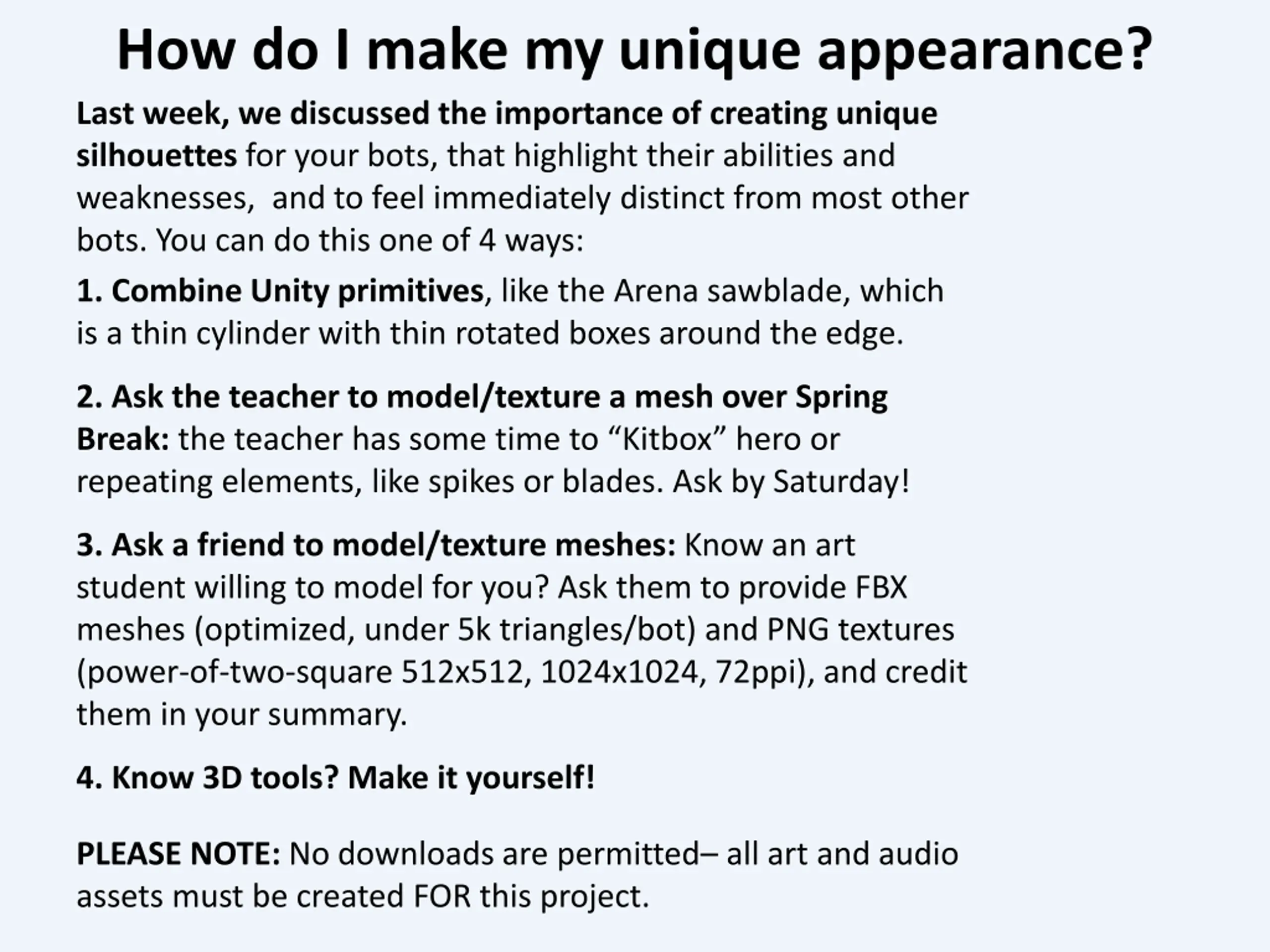 How do I make my unique appearance? Last week, we discussed the importance of creating unique silhouettes for your bots, that highlight their abilities and weaknesses, and to feel immediately distinct from most other bots. You can do this one of 4 ways: 1. Combine Unity primitives, like the Arena sawblade, which is a thin cylinder with thin rotated boxes around the edge. 2. Ask the teacher to model/texture a mesh over Spring Break: the teacher has some time to Kitbox hero or repeating elements, like spikes or blades. Ask by Saturday! 3. Ask a friend to model/texture meshes: Know an art student willing to model for you? Ask them to provide FBX meshes (optimized, under 5k triangles/bot) and PNG textures (power-of-two-square 512x512, 1024x1024, 72ppi), and credit them in your summary. 4. Know 3D tools? Make it yourself! PLEASE NOTE: No downloads are permitted all art and audio assets must be created FOR this project.
