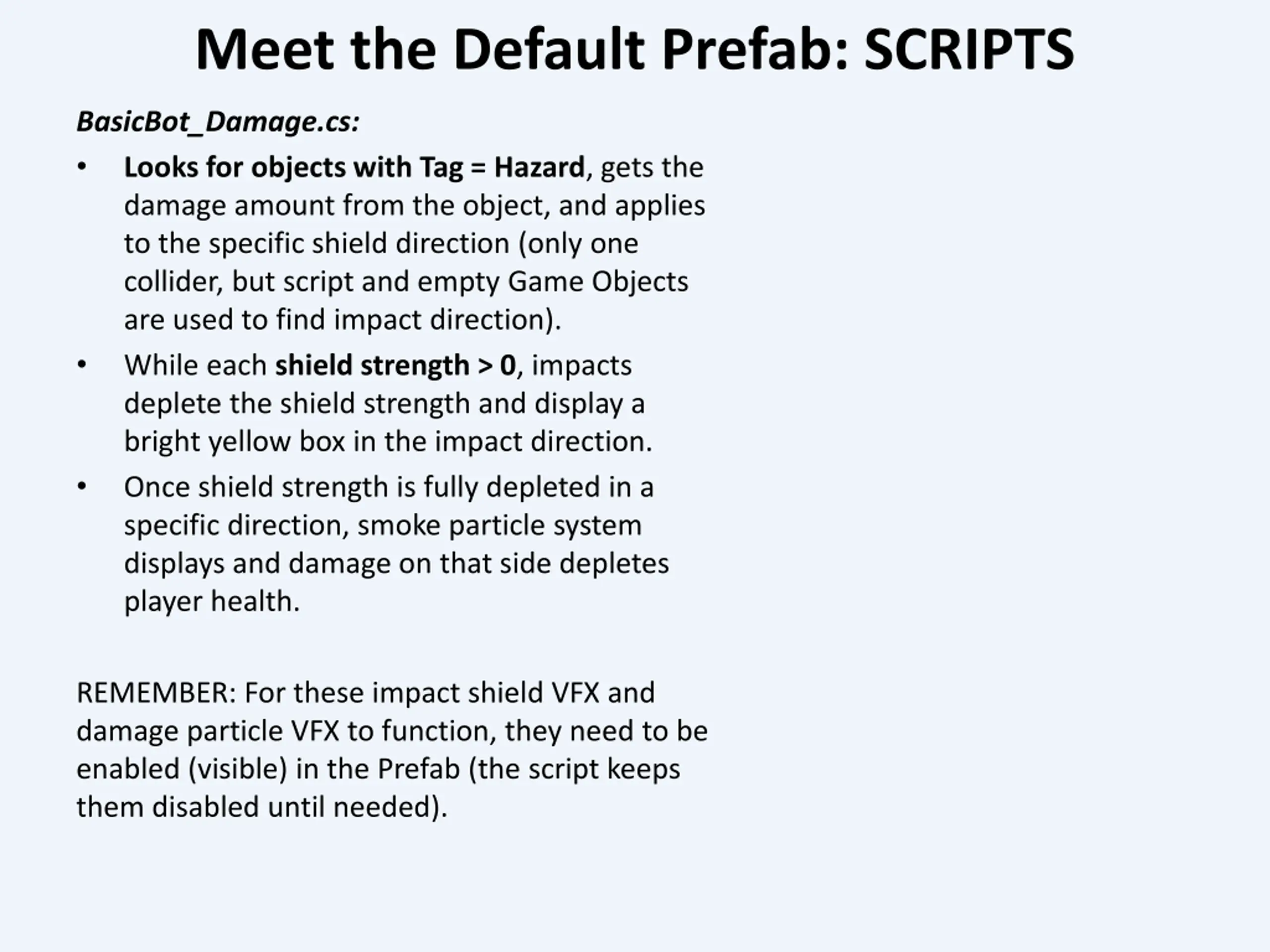 Meet the Default Prefab: SCRIPTS BasicBot_Damage.cs: Looks for objects with Tag = Hazard, gets the damage amount from the object, and applies to the specific shield direction (only one collider, but script and empty Game Objects are used to find impact direction). While each shield strength > 0, impacts deplete the shield strength and display a bright yellow box in the impact direction. Once shield strength is fully depleted in a specific direction, smoke particle system displays and damage on that side depletes player health. REMEMBER: For these impact shield VFX and damage particle VFX to function, they need to be enabled (visible) in the Prefab (the script keeps them disabled until needed).