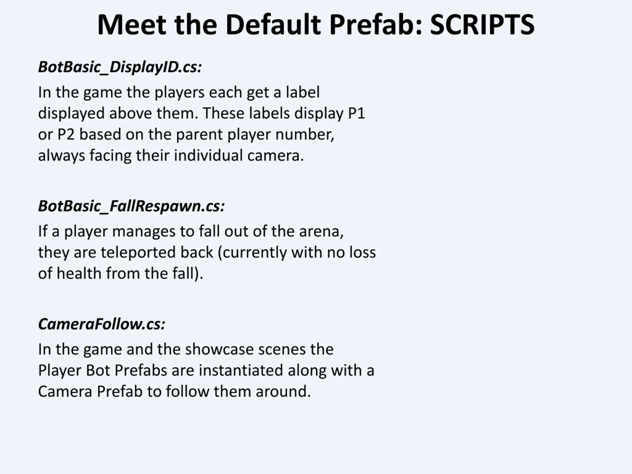 Meet the Default Prefab: SCRIPTS BotBasic_DisplayID.cs: In the game the players each get a label displayed above them. These labels display P1 or P2 based on the parent player number, always facing their individual camera. BotBasic_FallRespawn.cs: If a player manages to fall out of the arena, they are teleported back (currently with no loss of health from the fall). CameraFollow.cs: In the game and the showcase scenes the Player Bot Prefabs are instantiated along with a Camera Prefab to follow them around.