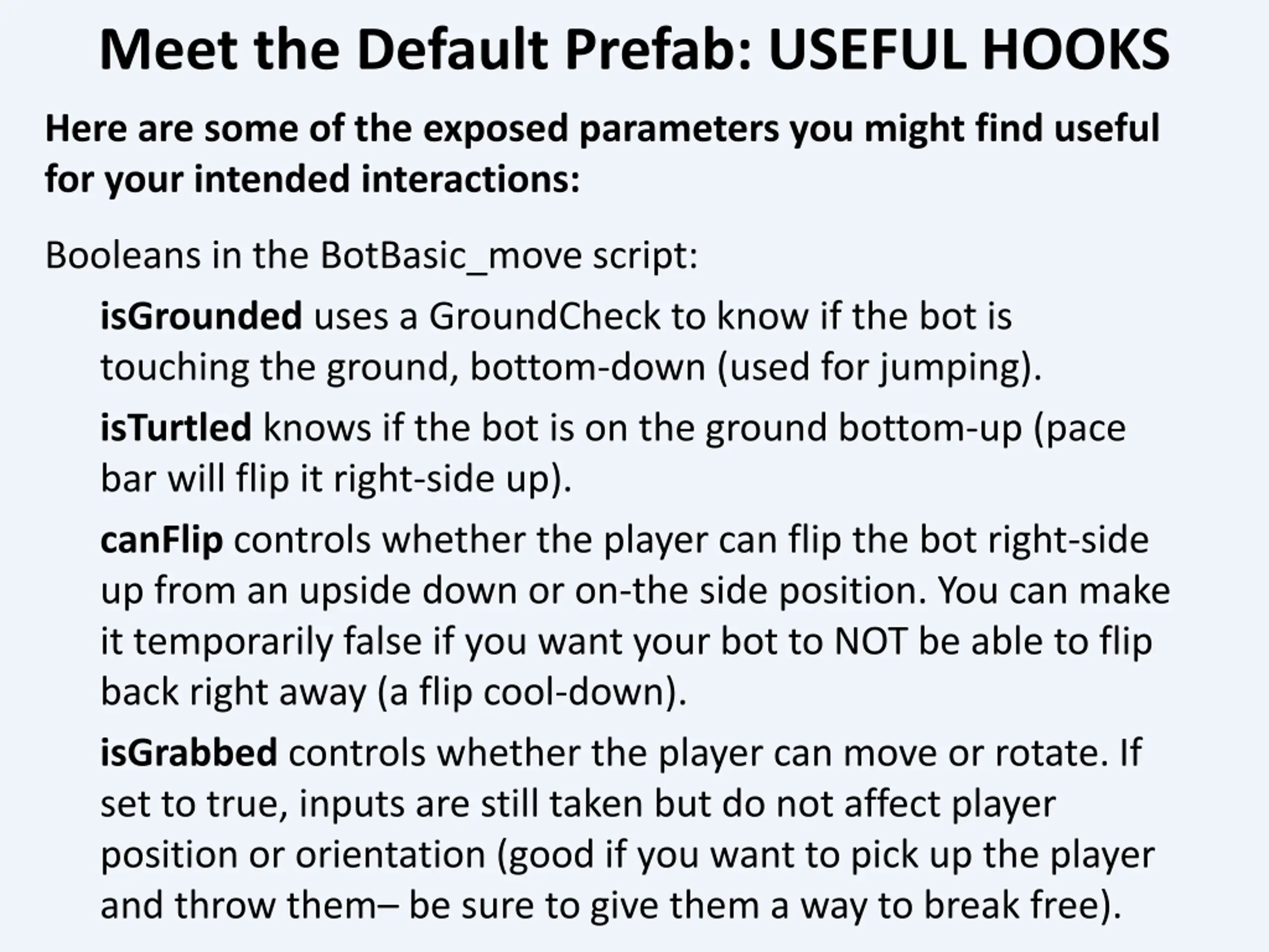 Meet the Default Prefab: USEFUL HOOKS Here are some of the exposed parameters you might find useful for your intended interactions: Booleans in the BotBasic_move script: isGrounded uses a GroundCheck to know if the bot is touching the ground, bottom-down (used for jumping). isTurtled knows if the bot is on the ground bottom-up (pace bar will flip it right-side up). canFlip controls whether the player can flip the bot right-side up from an upside down or on-the side position. You can make it temporarily false if you want your bot to NOT be able to flip back right away (a flip cool-down). isGrabbed controls whether the player can move or rotate. If set to true, inputs are still taken but do not affect player position or orientation (good if you want to pick up the player and throw them be sure to give them a way to break free).