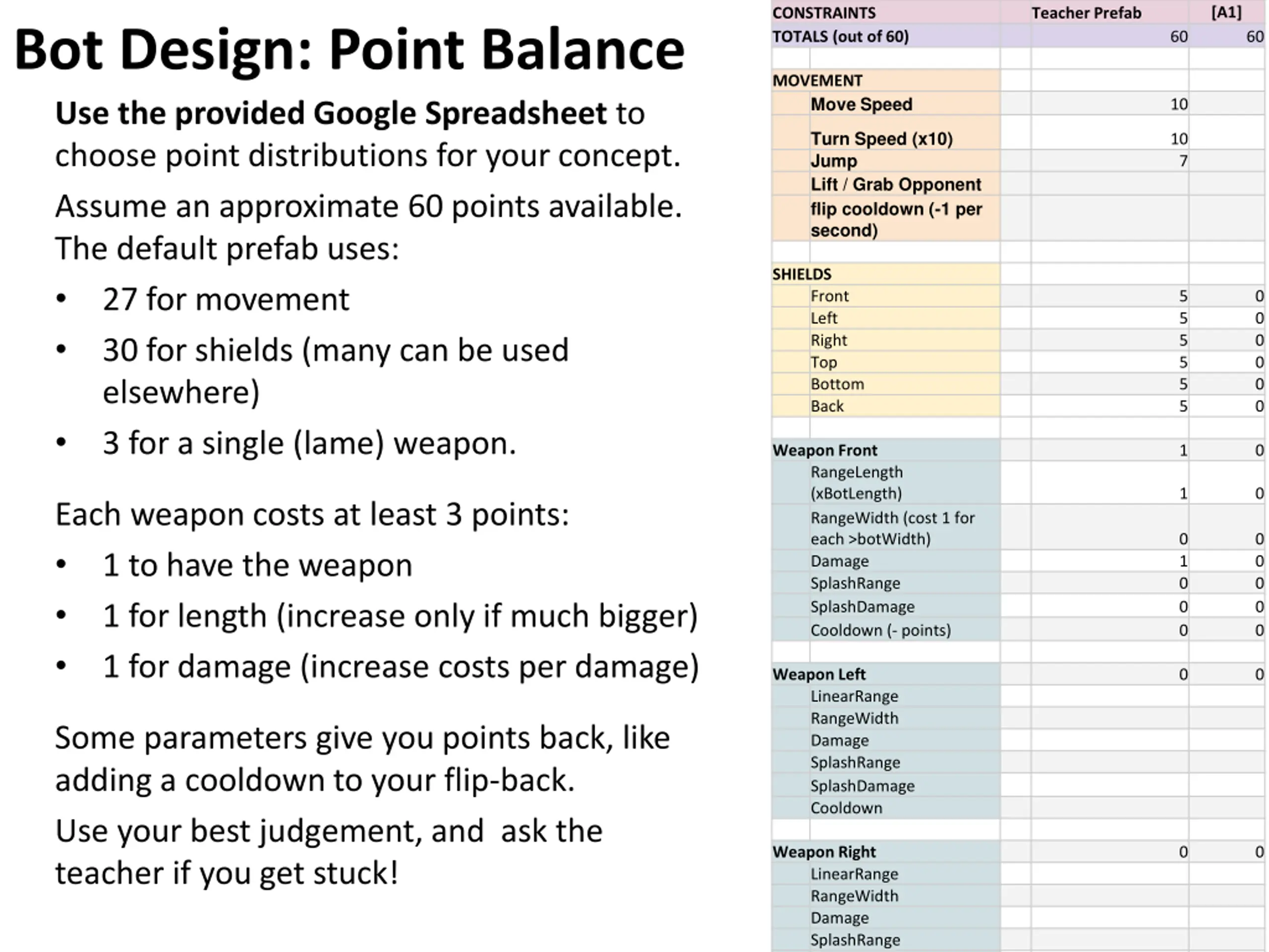 [A1] CONSTRAINTS TOTALS (out of 60) Teacher Prefab Bot Design: Point Balance Use the provided Google Spreadsheet to choose point distributions for your concept. Assume an approximate 60 points available. The default prefab uses: 27 for movement 30 for shields (many can be used elsewhere) 3 for a single (lame) weapon. 60 60 MOVEMENT Move Speed 10 Turn Speed (x10) Jump Lift / Grab Opponent flip cooldown (-1 per second) 10 7 SHIELDS Front Left Right Top Bottom Back 5 5 5 5 5 5 0 0 0 0 0 0 Weapon Front RangeLength (xBotLength) RangeWidth (cost 1 for each >botWidth) Damage SplashRange SplashDamage Cooldown (- points) 1 0 1 0 Each weapon costs at least 3 points: 1 to have the weapon 1 for length (increase only if much bigger) 1 for damage (increase costs per damage) 0 1 0 0 0 0 0 0 0 0 Weapon Left LinearRange RangeWidth Damage SplashRange SplashDamage Cooldown 0 0 Some parameters give you points back, like adding a cooldown to your flip-back. Use your best judgement, and ask the teacher if you get stuck! Weapon Right LinearRange RangeWidth Damage SplashRange SplashDamage 0 0