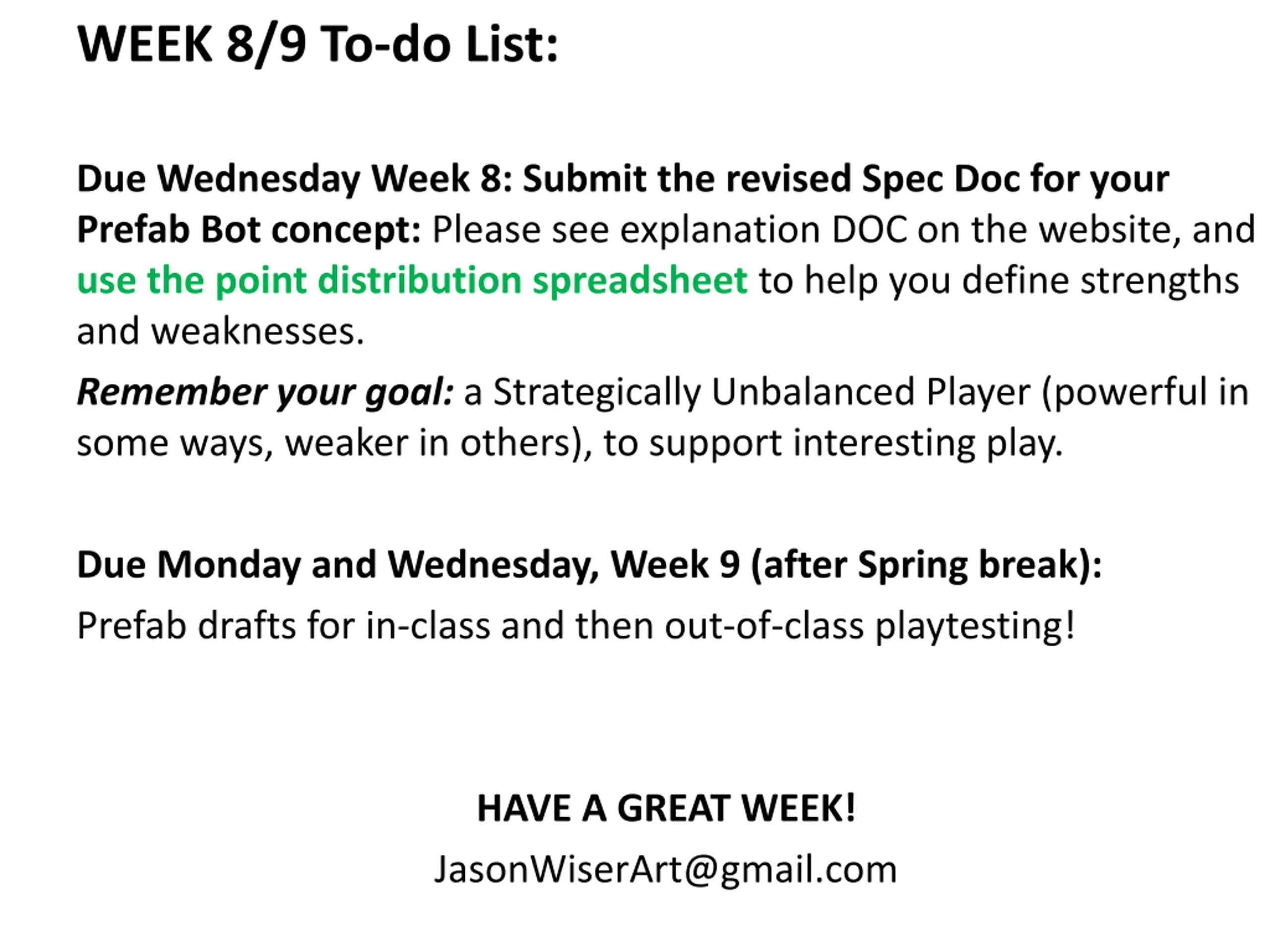 WEEK 8/9 To-do List: Due Wednesday Week 8: Submit the revised Spec Doc for your Prefab Bot concept: Please see explanation DOC on the website, and use the point distribution spreadsheet to help you define strengths and weaknesses. Remember your goal: a Strategically Unbalanced Player (powerful in some ways, weaker in others), to support interesting play. Due Monday and Wednesday, Week 9 (after Spring break): Prefab drafts for in-class and then out-of-class playtesting! HAVE A GREAT WEEK! JasonWiserArt@gmail.com