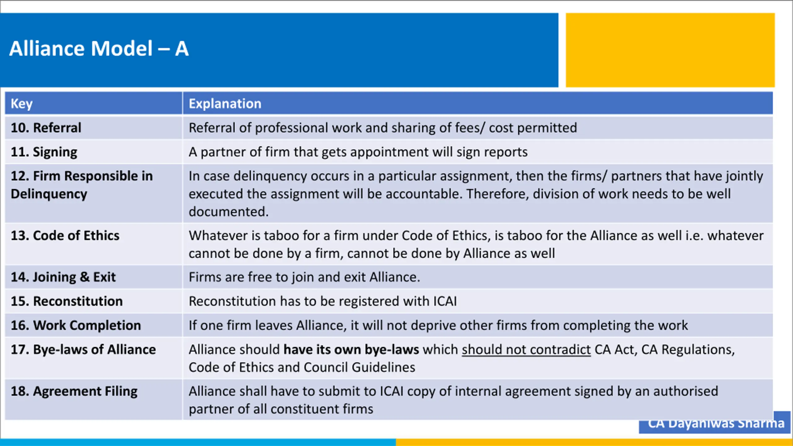 Alliance Model A Key Explanation 10. Referral Referral of professional work and sharing of fees/ cost permitted 11. Signing A partner of firm that gets appointment will sign reports 12. Firm Responsible in Delinquency In case delinquency occurs in a particular assignment, then the firms/ partners that have jointly executed the assignment will be accountable. Therefore, division of work needs to be well documented. 13. Code of Ethics Whatever is taboo for a firm under Code of Ethics, is taboo for the Alliance as well i.e. whatever cannot be done by a firm, cannot be done by Alliance as well 14. Joining & Exit Firms are free to join and exit Alliance. 15. Reconstitution Reconstitution has to be registered with ICAI 16. Work Completion If one firm leaves Alliance, it will not deprive other firms from completing the work 17. Bye-laws of Alliance Alliance should have its own bye-laws which should not contradict CA Act, CA Regulations, Code of Ethics and Council Guidelines 18. Agreement Filing Alliance shall have to submit to ICAI copy of internal agreement signed by an authorised partner of all constituent firms CA Dayaniwas Sharma