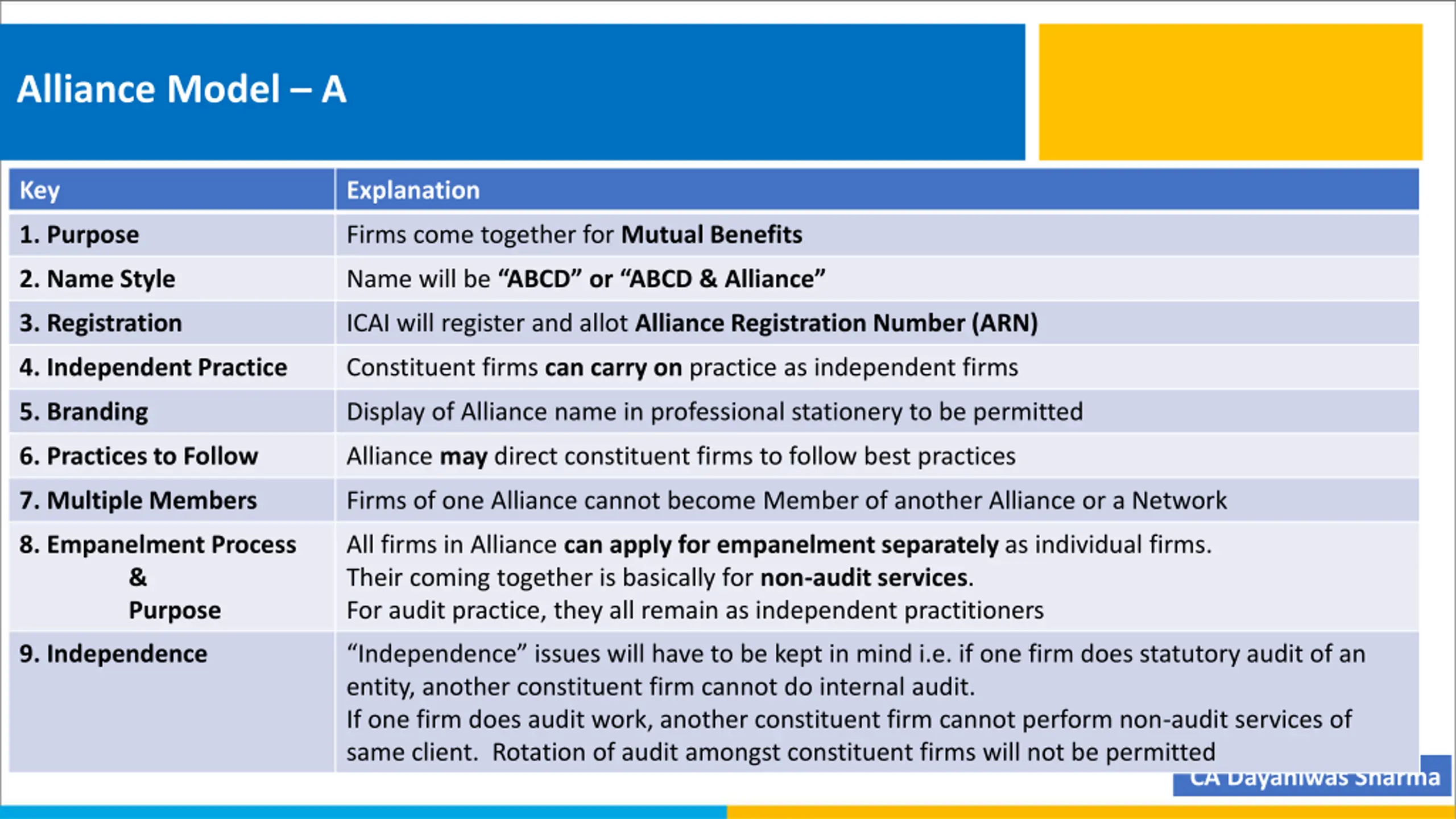 Alliance Model A Key Explanation 1. Purpose Firms come together for Mutual Benefits 2. Name Style Name will be ABCD or ABCD & Alliance 3. Registration ICAI will register and allot Alliance Registration Number (ARN) 4. Independent Practice Constituent firms can carry on practice as independent firms 5. Branding Display of Alliance name in professional stationery to be permitted 6. Practices to Follow Alliance may direct constituent firms to follow best practices 7. Multiple Members Firms of one Alliance cannot become Member of another Alliance or a Network 8. Empanelment Process & Purpose All firms in Alliance can apply for empanelment separately as individual firms. Their coming together is basically for non-audit services. For audit practice, they all remain as independent practitioners 9. Independence Independence issues will have to be kept in mind i.e. if one firm does statutory audit of an entity, another constituent firm cannot do internal audit. If one firm does audit work, another constituent firm cannot perform non-audit services of same client. Rotation of audit amongst constituent firms will not be permitted CA Dayaniwas Sharma