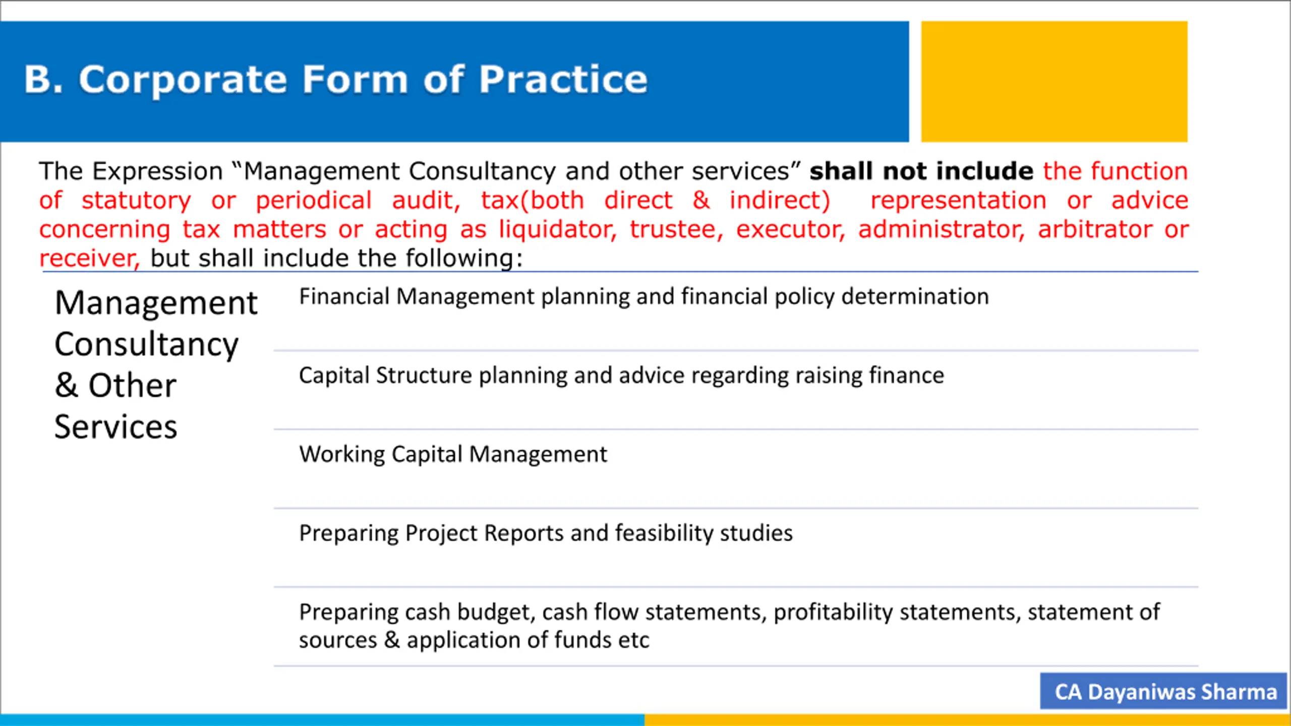 B. Corporate Form of Practice The Expression Management Consultancy and other services shall not include the function of statutory or periodical audit, tax(both direct & indirect) representation or advice concerning tax matters or acting as liquidator, trustee, executor, administrator, arbitrator or receiver, but shall include the following: Management Consultancy & Other Services Working Capital Management Financial Management planning and financial policy determination Capital Structure planning and advice regarding raising finance Preparing Project Reports and feasibility studies Preparing cash budget, cash flow statements, profitability statements, statement of sources & application of funds etc CA Dayaniwas Sharma