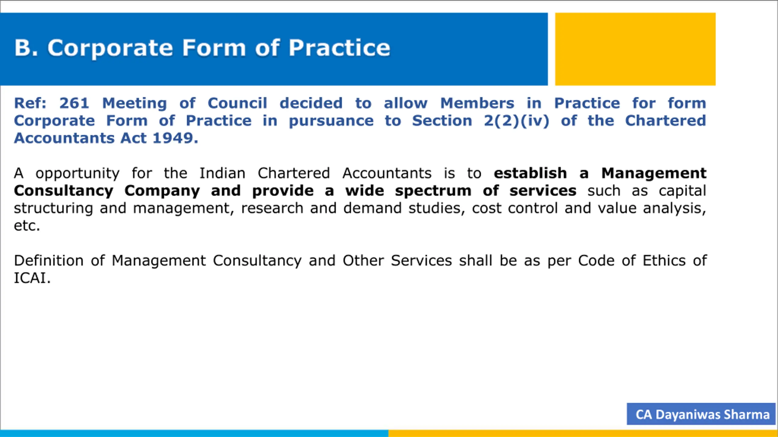 B. Corporate Form of Practice Ref: 261 Meeting of Council decided to allow Members in Practice for form Corporate Form of Practice in pursuance to Section 2(2)(iv) of the Chartered Accountants Act 1949. A opportunity for the Indian Chartered Accountants is to establish a Management Consultancy Company and provide a wide spectrum of services such as capital structuring and management, research and demand studies, cost control and value analysis, etc. Definition of Management Consultancy and Other Services shall be as per Code of Ethics of ICAI. CA Dayaniwas Sharma