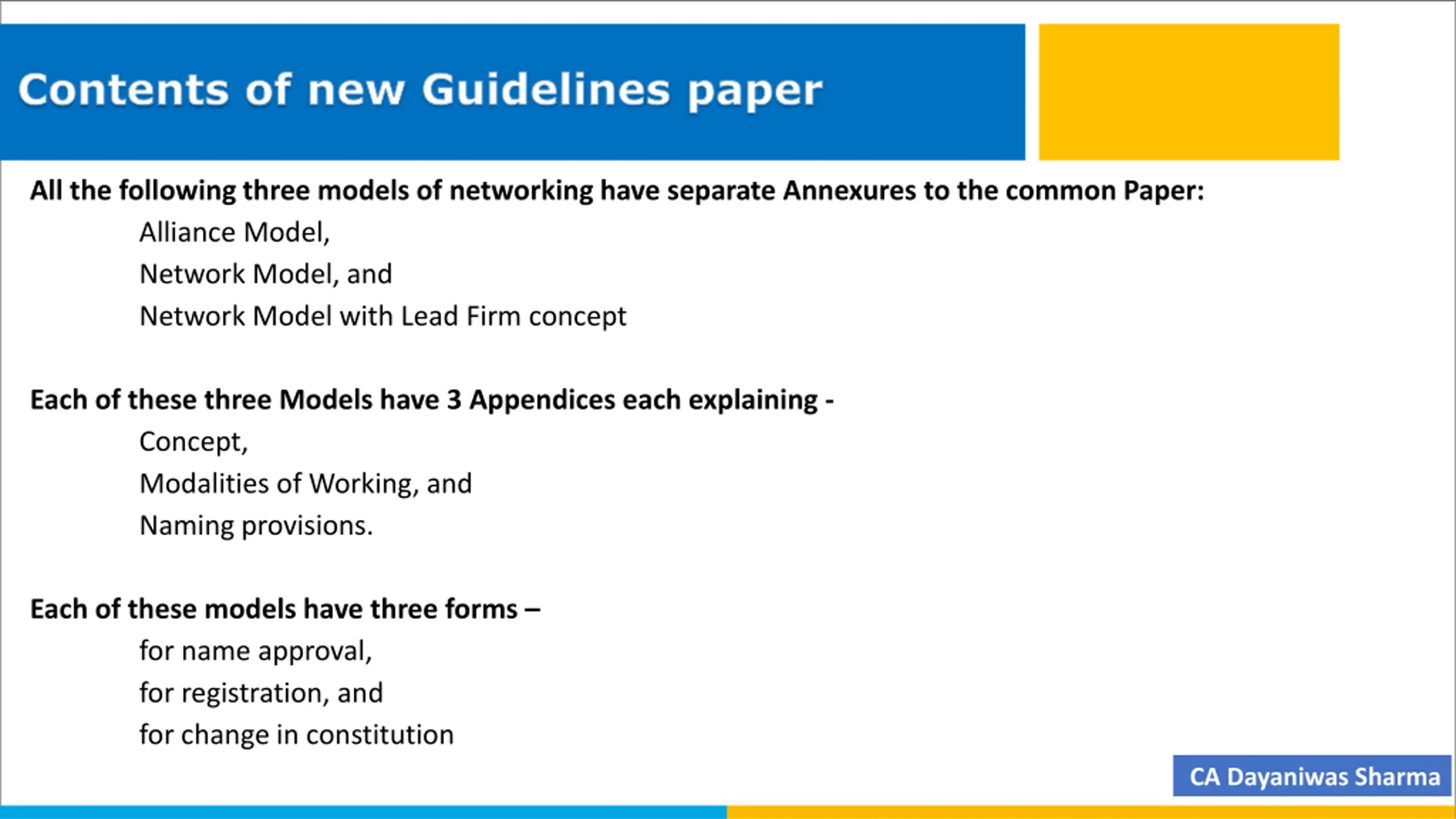 Contents of new Guidelines paper All the following three models of networking have separate Annexures to the common Paper: Alliance Model, Network Model, and Network Model with Lead Firm concept Each of these three Models have 3 Appendices each explaining - Concept, Modalities of Working, and Naming provisions. Each of these models have three forms for name approval, for registration, and for change in constitution CA Dayaniwas Sharma