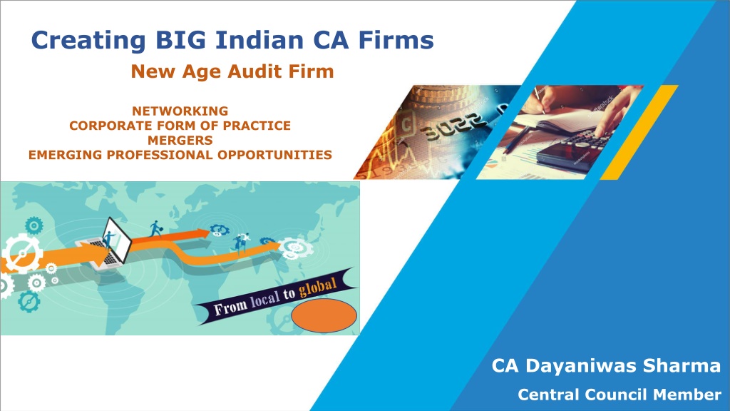 Creating BIG Indian CA Firms New Age Audit Firm NETWORKING CORPORATE FORM OF PRACTICE MERGERS EMERGING PROFESSIONAL OPPORTUNITIES CA Dayaniwas Sharma Central Council Member