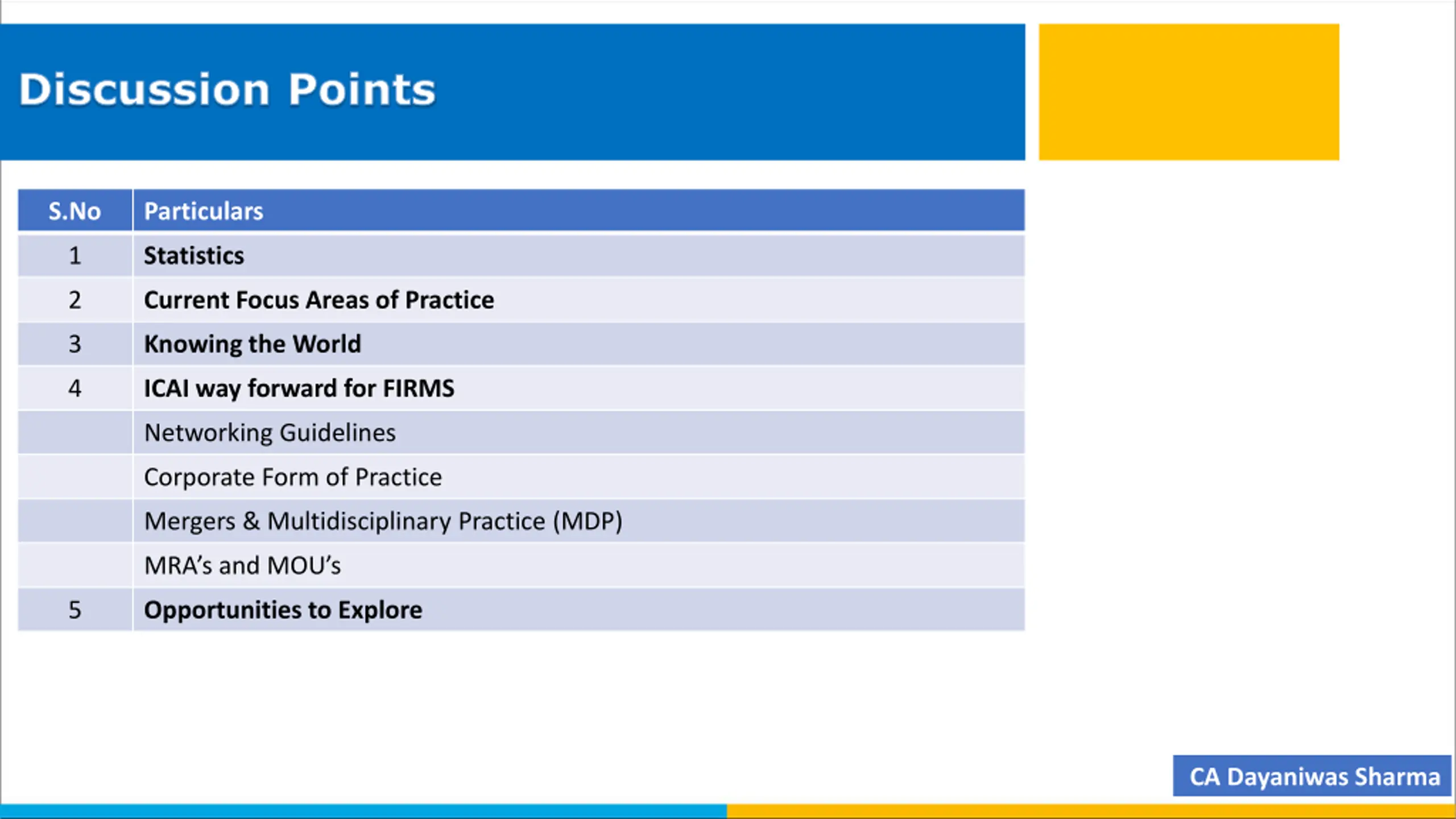 Discussion Points S.No Particulars 1 Statistics 2 Current Focus Areas of Practice 3 Knowing the World 4 ICAI way forward for FIRMS Networking Guidelines Corporate Form of Practice Mergers & Multidisciplinary Practice (MDP) MRA s and MOU s 5 Opportunities to Explore CA Dayaniwas Sharma
