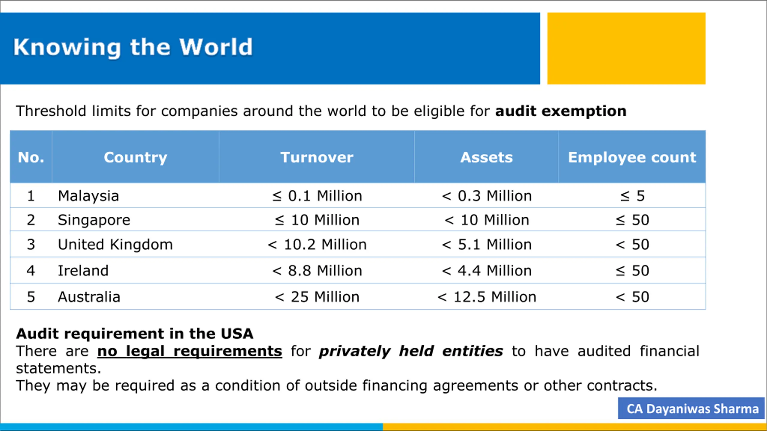 Knowing the World Threshold limits for companies around the world to be eligible for audit exemption No. Country Turnover Assets Employee count 1 2 3 Malaysia Singapore United Kingdom 0.1 Million 10 Million < 10.2 Million < 0.3 Million < 10 Million < 5.1 Million 5 50 < 50 4 Ireland < 8.8 Million < 4.4 Million 50 5 Australia < 25 Million < 12.5 Million < 50 Audit requirement in the USA There are no legal requirements for privately held entities to have audited financial statements. They may be required as a condition of outside financing agreements or other contracts. CA Dayaniwas Sharma