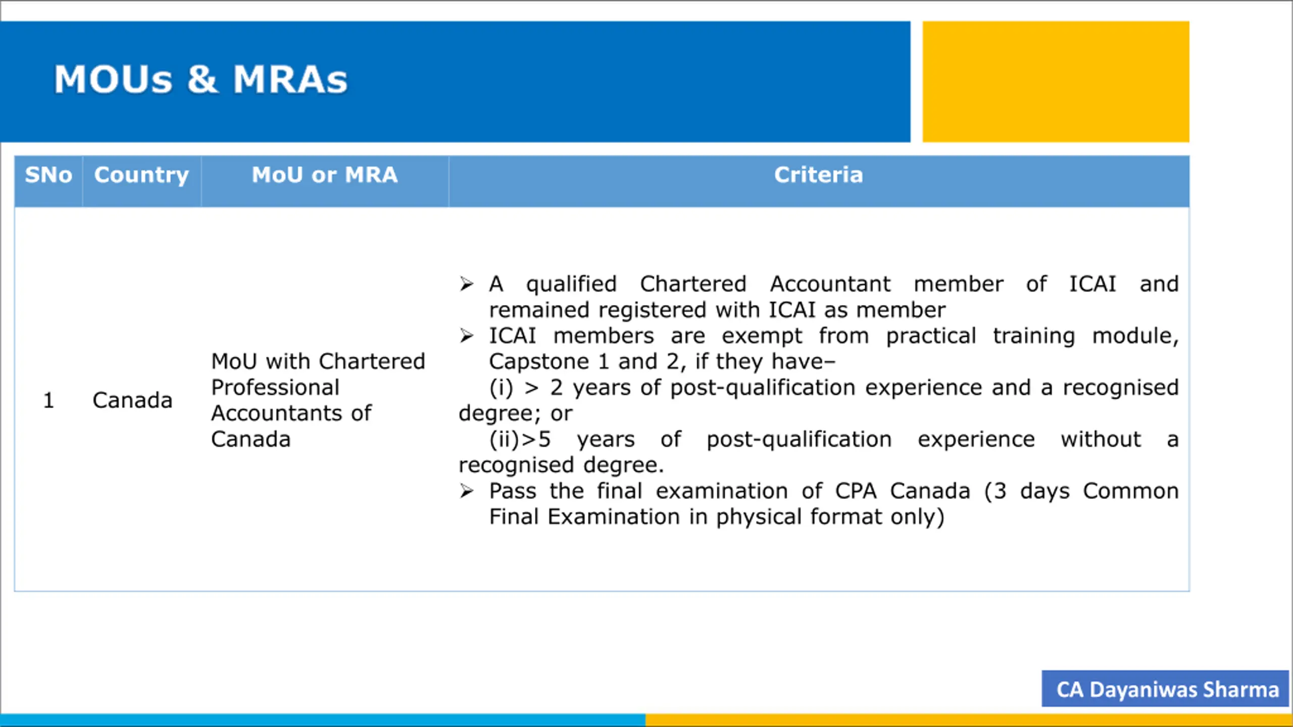 MOUs & MRAs SNo Country MoU or MRA Criteria A qualified Chartered Accountant member of ICAI and remained registered with ICAI as member ICAI members are exempt from practical training module, Capstone 1 and 2, if they have (i) > 2 years of post-qualification experience and a recognised degree; or (ii)>5 years of post-qualification experience without a recognised degree. Pass the final examination of CPA Canada (3 days Common Final Examination in physical format only) MoU with Chartered Professional Accountants of Canada 1 Canada CA Dayaniwas Sharma