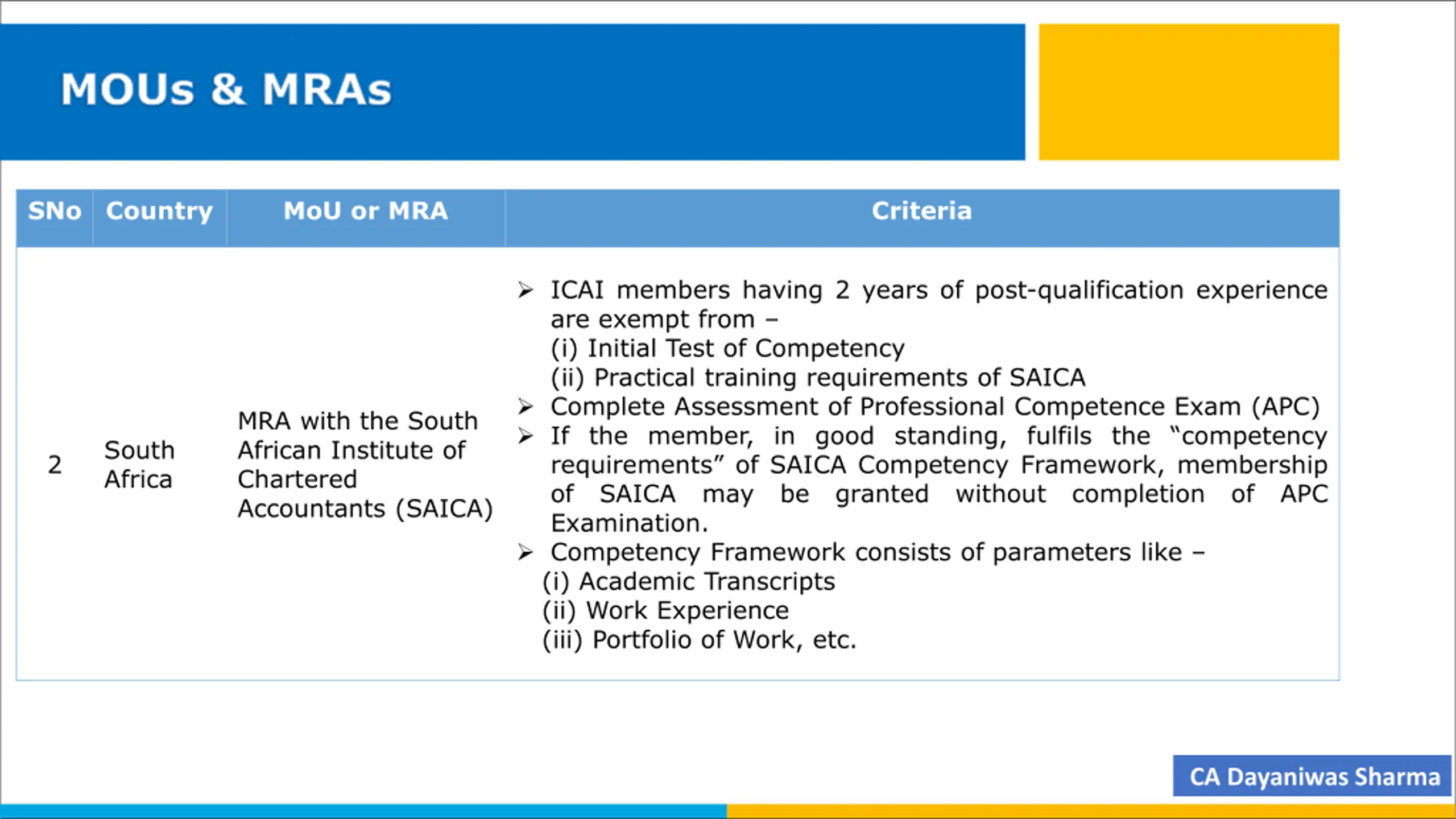 MOUs & MRAs SNo Country MoU or MRA Criteria ICAI members having 2 years of post-qualification experience are exempt from (i) Initial Test of Competency (ii) Practical training requirements of SAICA Complete Assessment of Professional Competence Exam (APC) If the member, in good standing, fulfils the competency requirements of SAICA Competency Framework, membership of SAICA may be granted without completion of APC Examination. Competency Framework consists of parameters like (i) Academic Transcripts (ii) Work Experience (iii) Portfolio of Work, etc. MRA with the South African Institute of Chartered Accountants (SAICA) South Africa 2 CA Dayaniwas Sharma