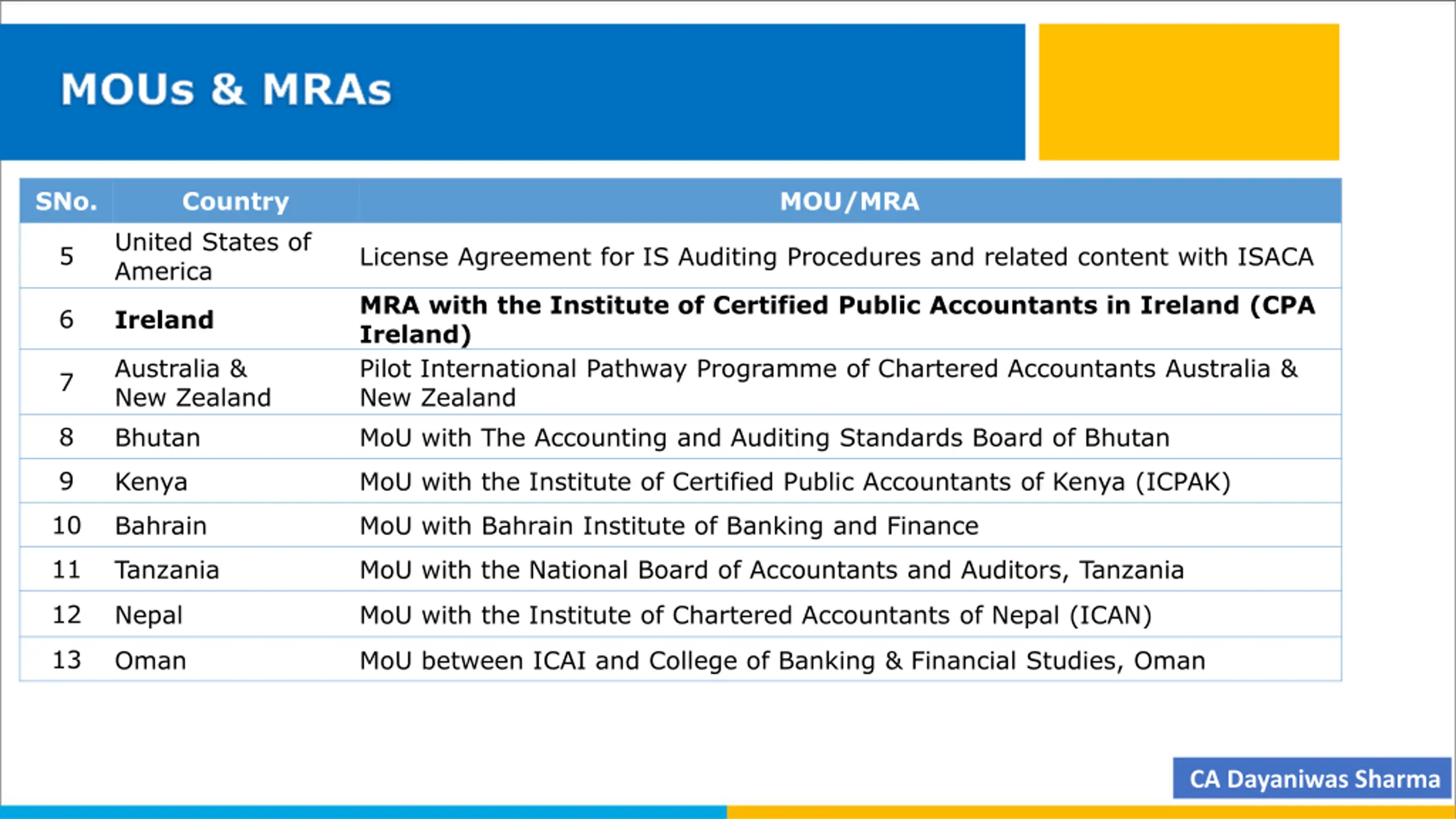 MOUs & MRAs SNo. Country MOU/MRA United States of America 5 License Agreement for IS Auditing Procedures and related content with ISACA MRA with the Institute of Certified Public Accountants in Ireland (CPA Ireland) Pilot International Pathway Programme of Chartered Accountants Australia & New Zealand MoU with The Accounting and Auditing Standards Board of Bhutan 6 Ireland Australia & New Zealand Bhutan 7 8 9 Kenya MoU with the Institute of Certified Public Accountants of Kenya (ICPAK) 10 Bahrain MoU with Bahrain Institute of Banking and Finance 11 Tanzania MoU with the National Board of Accountants and Auditors, Tanzania 12 Nepal MoU with the Institute of Chartered Accountants of Nepal (ICAN) 13 Oman MoU between ICAI and College of Banking & Financial Studies, Oman CA Dayaniwas Sharma