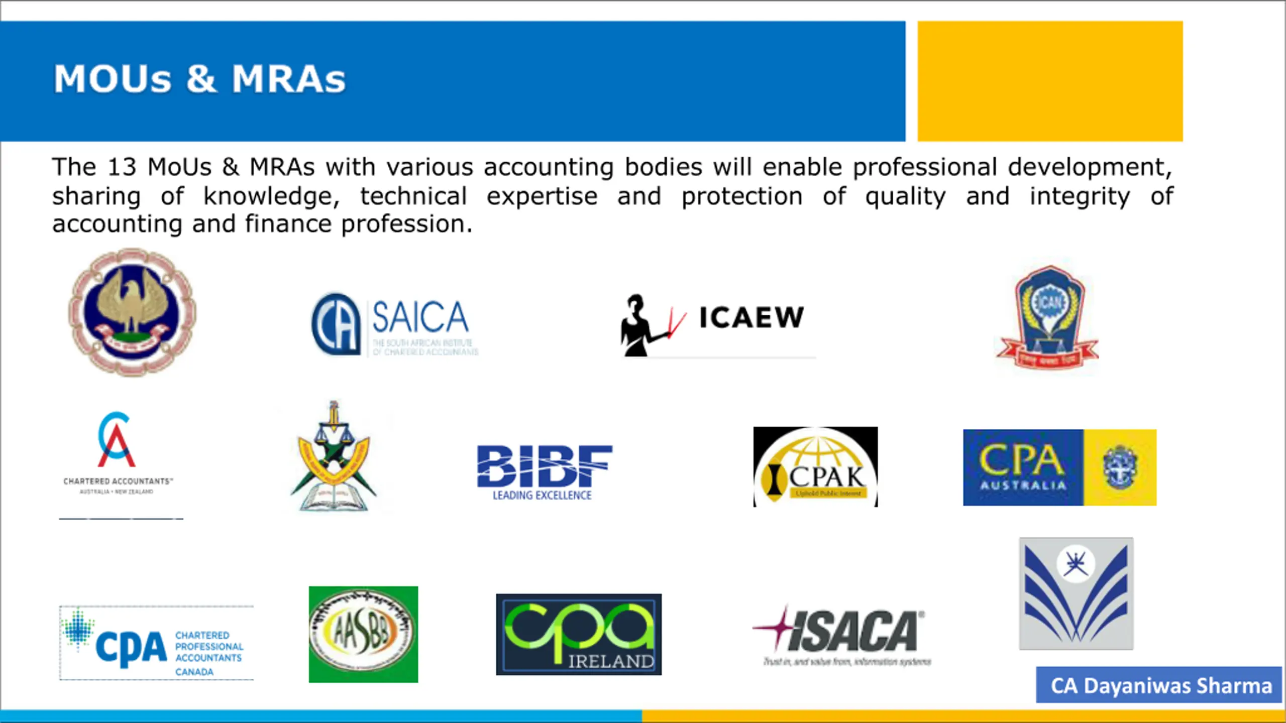 MOUs & MRAs The 13 MoUs & MRAs with various accounting bodies will enable professional development, sharing of knowledge, technical expertise and protection of quality and integrity of accounting and finance profession. CA Dayaniwas Sharma
