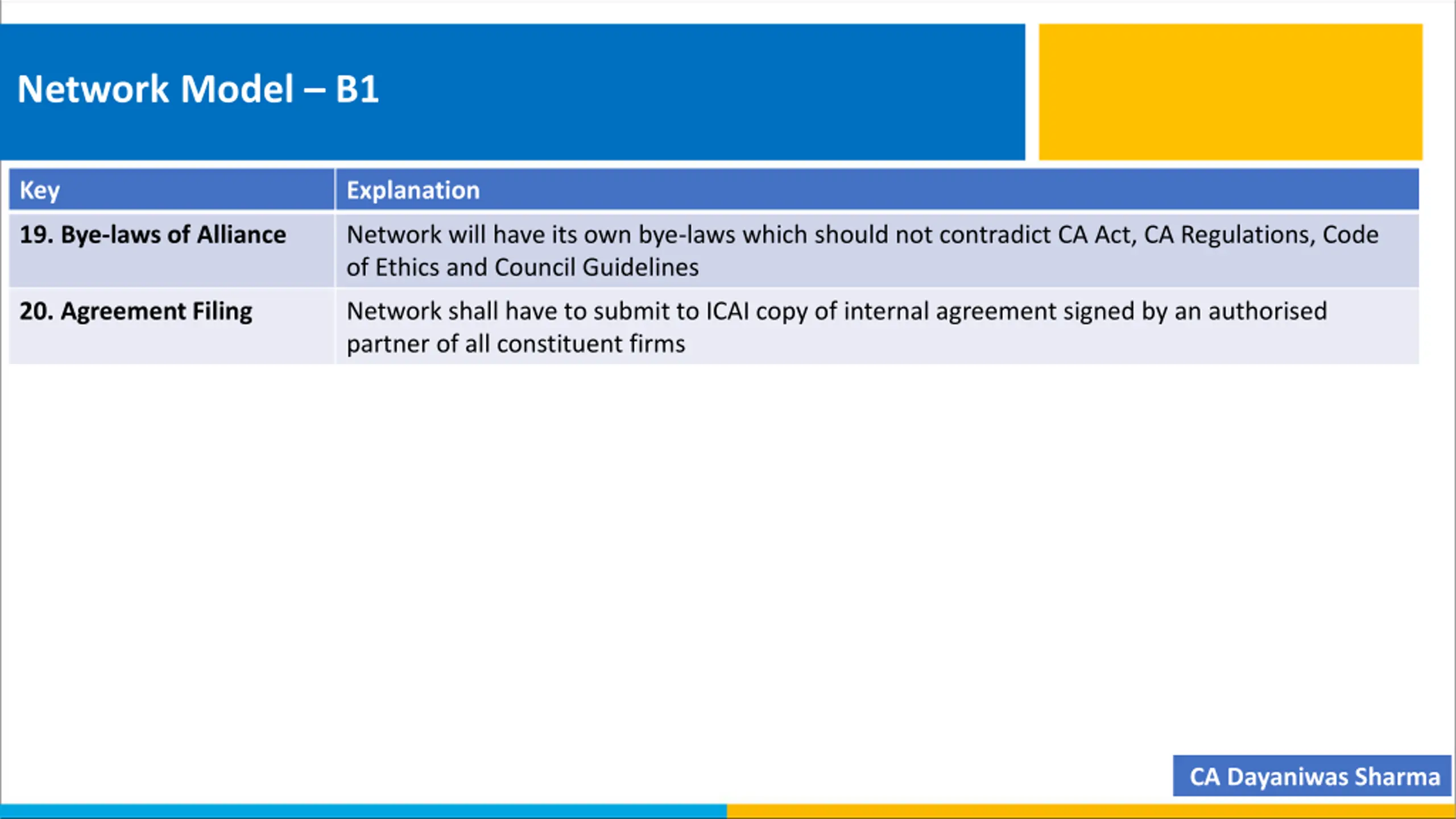Network Model B1 Key Explanation 19. Bye-laws of Alliance Network will have its own bye-laws which should not contradict CA Act, CA Regulations, Code of Ethics and Council Guidelines 20. Agreement Filing Network shall have to submit to ICAI copy of internal agreement signed by an authorised partner of all constituent firms CA Dayaniwas Sharma
