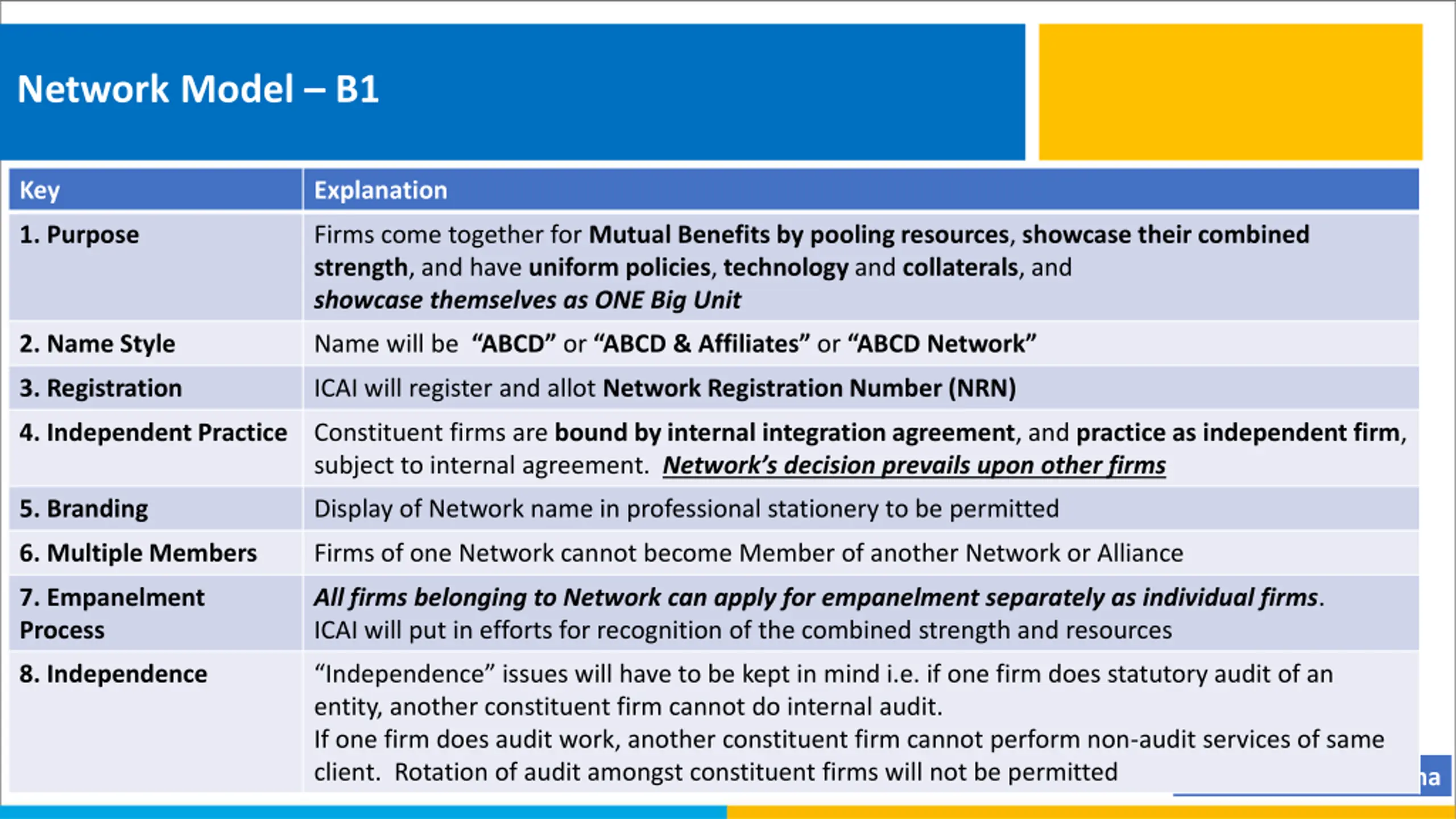 Network Model B1 Key Explanation 1. Purpose Firms come together for Mutual Benefits by pooling resources, showcase their combined strength, and have uniform policies, technology and collaterals, and showcase themselves as ONE Big Unit 2. Name Style Name will be ABCD or ABCD & Affiliates or ABCD Network 3. Registration ICAI will register and allot Network Registration Number (NRN) 4. Independent Practice Constituent firms are bound by internal integration agreement, and practice as independent firm, subject to internal agreement. Network s decision prevails upon other firms 5. Branding Display of Network name in professional stationery to be permitted 6. Multiple Members Firms of one Network cannot become Member of another Network or Alliance 7. Empanelment Process All firms belonging to Network can apply for empanelment separately as individual firms. ICAI will put in efforts for recognition of the combined strength and resources 8. Independence Independence issues will have to be kept in mind i.e. if one firm does statutory audit of an entity, another constituent firm cannot do internal audit. If one firm does audit work, another constituent firm cannot perform non-audit services of same client. Rotation of audit amongst constituent firms will not be permitted CA Dayaniwas Sharma