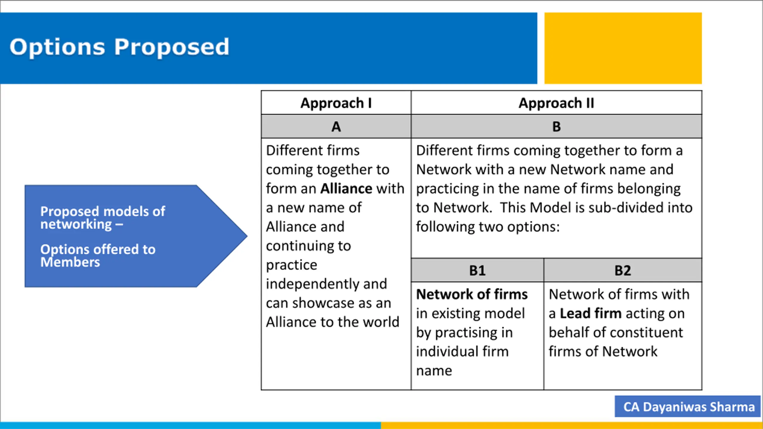 Options Proposed Approach I A Different firms coming together to form an Alliance with a new name of Alliance and continuing to practice independently and can showcase as an Alliance to the world Approach II B Different firms coming together to form a Network with a new Network name and practicing in the name of firms belonging to Network. This Model is sub-divided into following two options: Proposed models of networking Options offered to Members B1 B2 Network of firms in existing model by practising in individual firm name Network of firms with a Lead firm acting on behalf of constituent firms of Network CA Dayaniwas Sharma